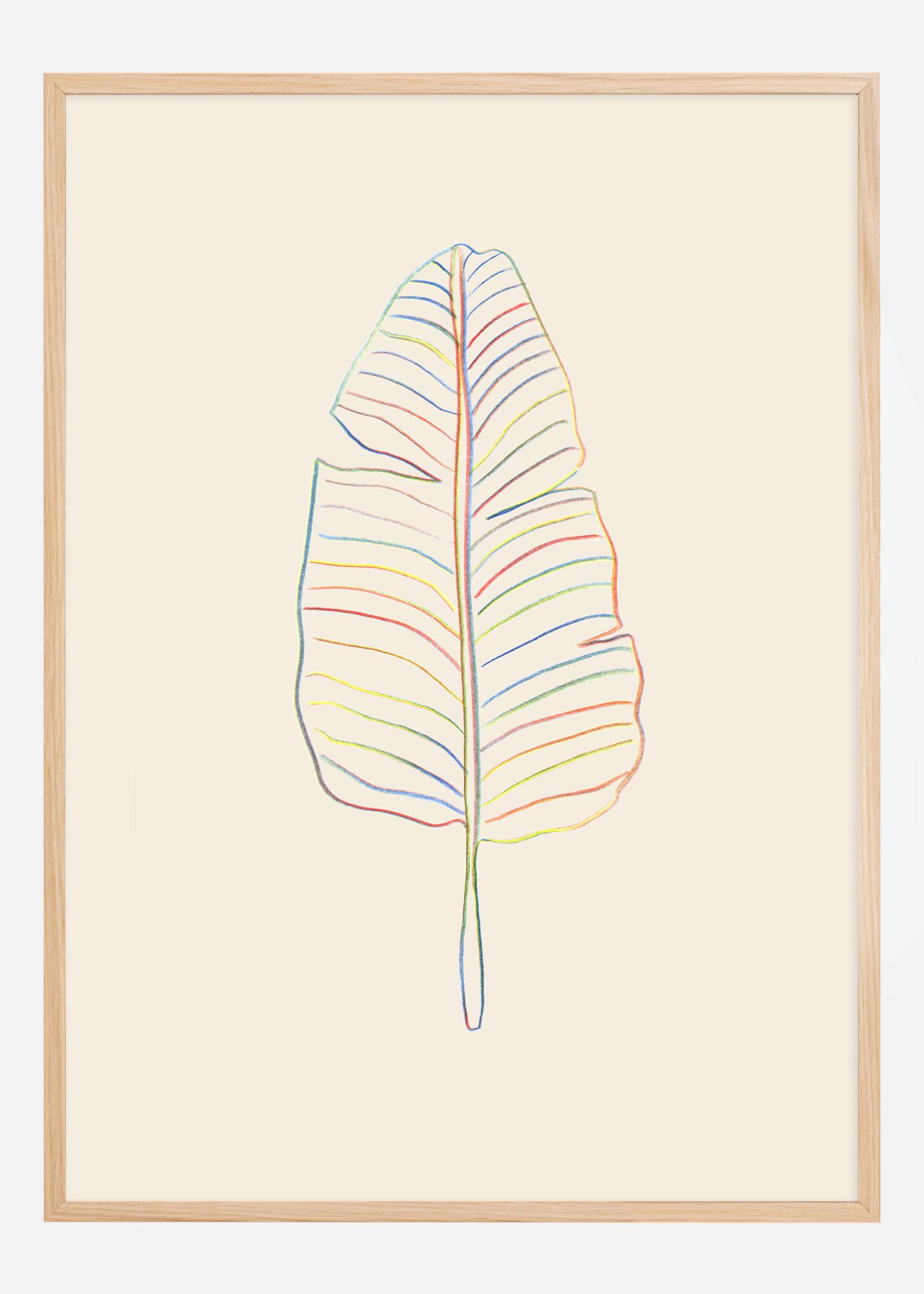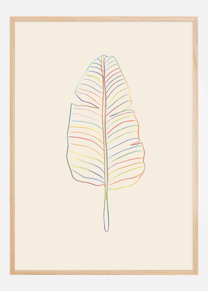 Tämä elävä ja värikäs juliste esittää luovan tulkinnan banaaninlehdestä, jossa on viivoja sateenkaaren väreissä. Leikkisä kontrasti lehden luonnollisten muotojen ja leikkisien värien välillä tuo modernin säväyksen klassiseen kasvitieteelliseen taiteeseen. Tämä printti on erinomainen esimerkki siitä, miten klassiset aiheet voidaan muuttaa väripopsahduksella moderniin estetiikkaan sopiviksi.