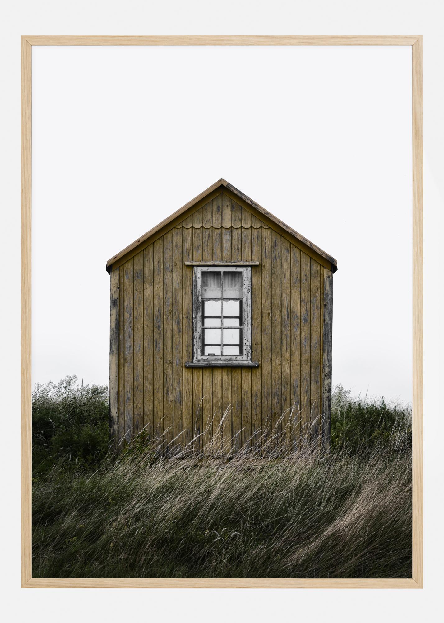 Tyylikäs maisemajuliste yksinkertaisesta puisesta rantamökistä. Yksinäinen mökki seisoo tuulen pyyhkimillä dyyneillä ja ruohikolla. Tunne avoimuus ja vapaus, kun lisäät tämän kotiisi.