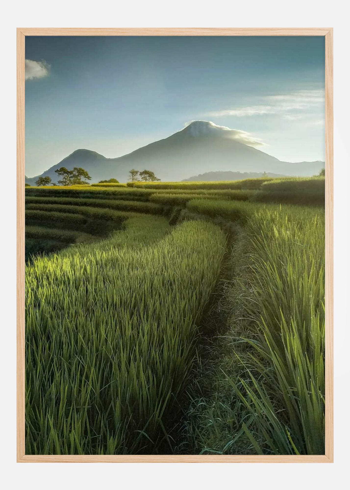 Tämä juliste tarjoaa näkymän pastoraaliseen idylliin, jossa vihreät riisipellot leviävät taustalla majesteettisten vuorten ja pehmeän taivaan edessä. Maiseman valaisu luo lämpimän ja kutsuvan tunteen, mikä tekee tästä printistä täydellisen tavan tuoda luonnon rauhaa ja kauneutta kotiin tai työpaikalle.