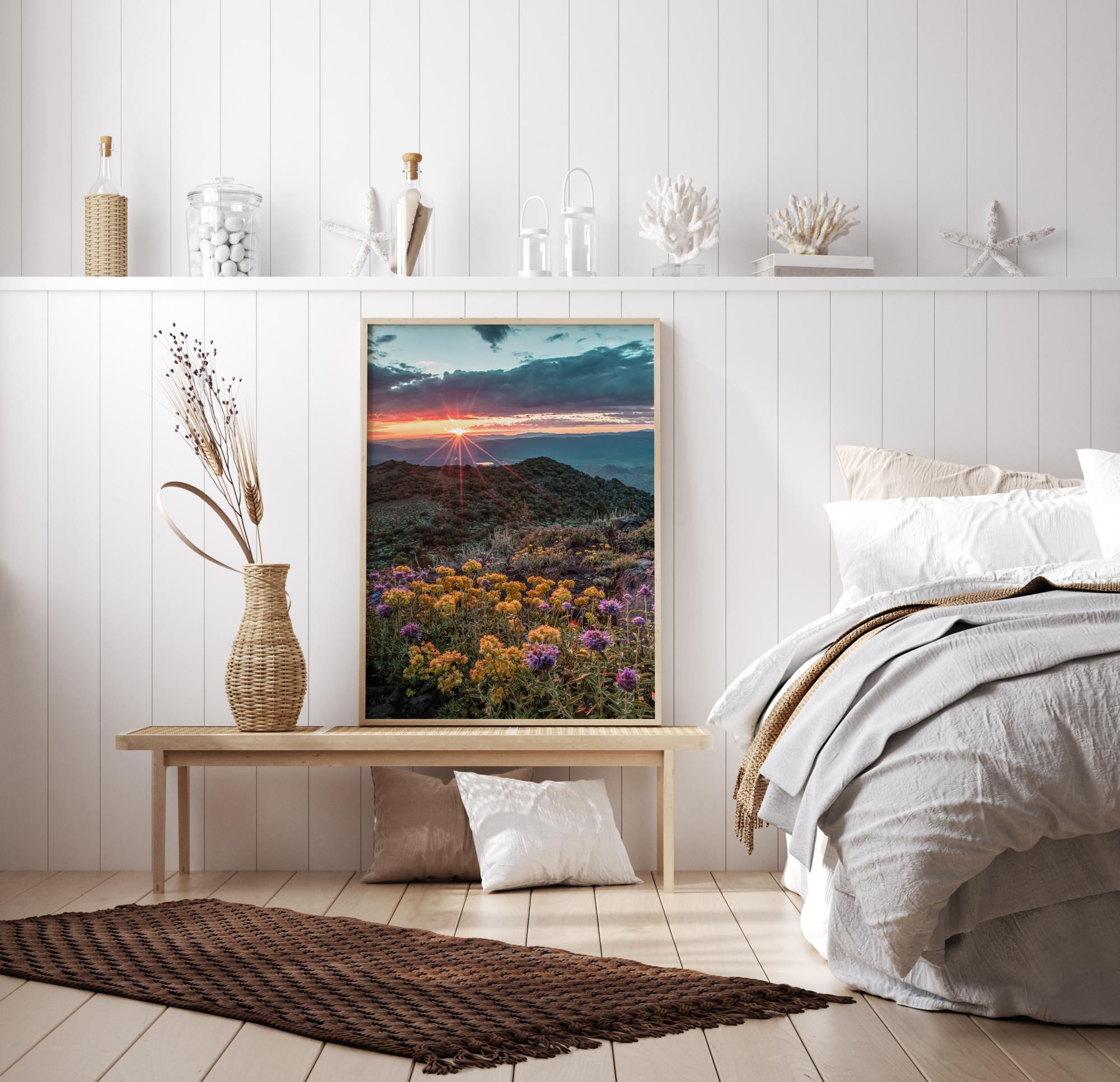 Luontojuliste, jossa on luonnonkukkia vuorenrinteellä ja upea auringonlasku. Kauniit keltaiset ja violetit kukat täyttävät kuvan ja johdattavat katseesi takaisin vuorenhuipuille ja pimenevälle taivaalle. Auringonlasku säteilee kuin punainen tähti tarjoten keskipisteen. Lisää tämä seinällesi luonnollisen tunnelman luomiseksi.