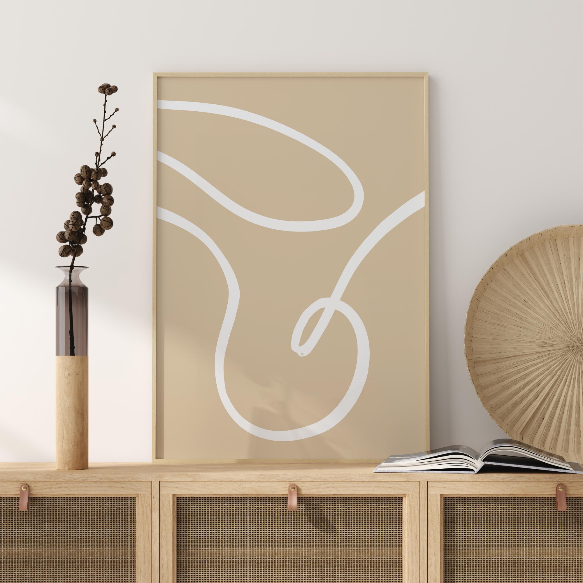 Yksinkertainen viivapiirrosjuliste, jossa kermanväriset viivat kiemurtelevat beigeä taustaa pitkin ja luovat kuvioita ruokkien mielikuvitustasi. Näe ja kuvittele, mitä haluat, kun tuijotat tätä teosta. Popahtavan vaikutelman saamiseksi lisää se kodin rohkean väriselle seinälle.