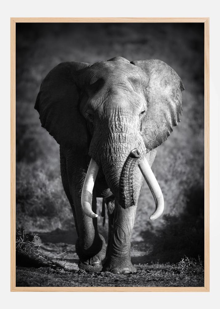 Tämä voimakas ja kiehtova juliste kuvaa norsua mustavalkoisena, korostaen tämän suurenmoisen olennon ryppyistä ihoa ja isoja syöksyhampaita. Norsun arvokas olemus on vangittu yksityiskohtaisesti, ja sen rauhallinen katse tarjoaa tunteen viisaudesta ja ajattomuudesta. Tämä kuva sopii täydellisesti jokaiselle, joka arvostaa villieläimiä ja luonnon voimakasta kauneutta ja haluaa lisätä ilmeikkään ja ajatuksia herättävän elementin kotiinsa tai toimistoonsa.