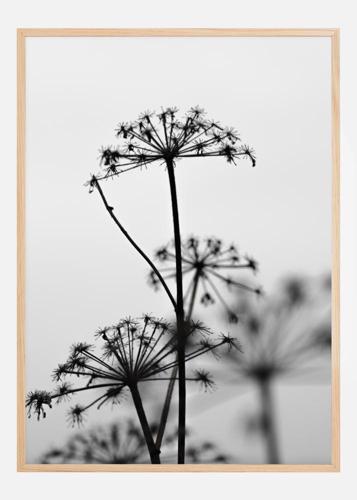 Yksinkertainen juliste sarjakukkaiskasvien päistä valkoista taustaa vasten. Näiden sarjakukkaiskasvien varsien ja siemenpäiden jyrkän mustat siluetit muodostavat kontrastin yksinkertaisen valkoisen taustan kanssa. Lisää tämä kiehtova teos värilliselle seinälle ihmetellessäsi näiden kukkien päiden yksityiskohtia.