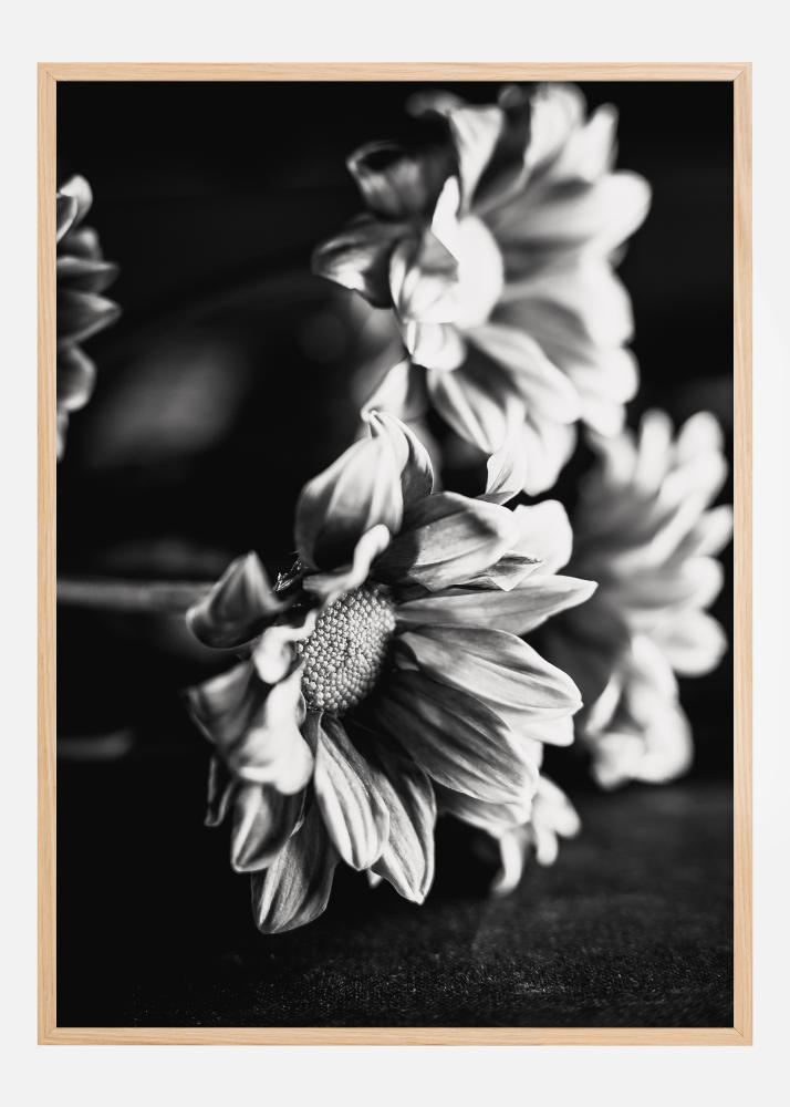 Tämä juliste kuvaa mustavalkoista kukka-asetelmaa, jossa varjot ja valo toimivat yhdessä korostaakseen jokaisen terälehden hienovaraisia ääriviivoja ja tekstuuria. Kuvan keskittyminen kontrastiin tumman ja vaalean välillä vangitsee kukkien kauneuden tavalla, joka antaa uuden arvostuksen niiden muodolle ja rakenteelle. Tämä juliste on hienostunut ja taiteellinen tulkinta luonnon ihmeistä, täydellinen luomaan rauhan ja kauneuden tunnetta mihin tahansa tilaan.