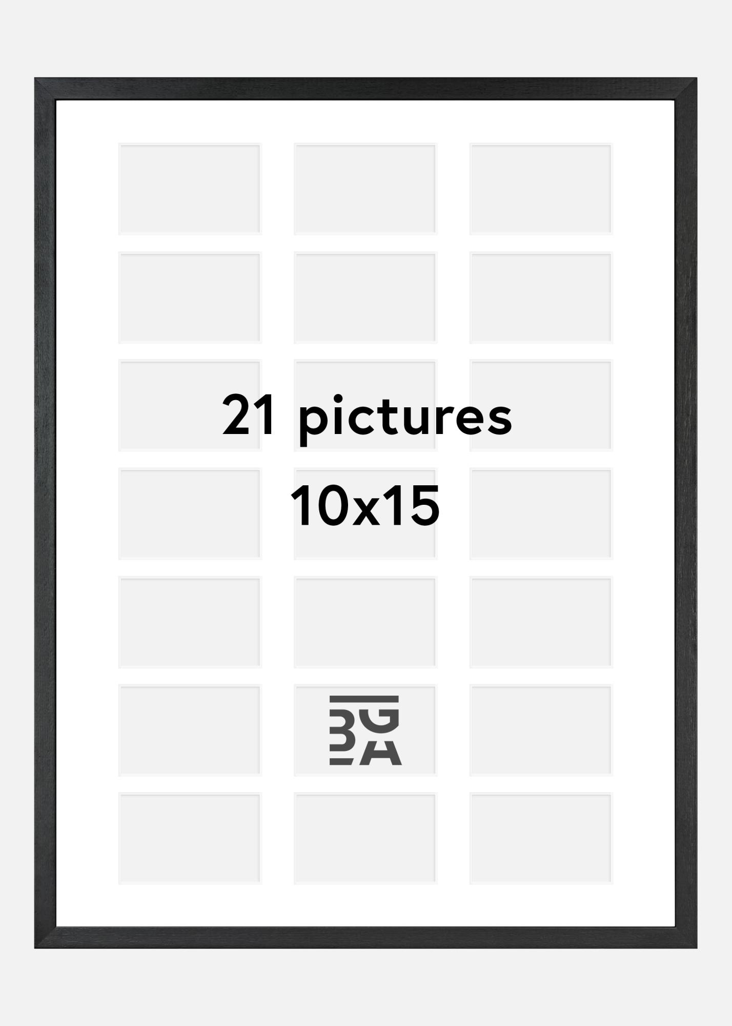 Black Wood-kehys on varustettu paspatuurilla, johon on leikattu valmiiksi aukot 21 kuvalle. Se sopii täydellisesti vaikkapa lapsikuville, lemmikkisi kuville tai lomareissukuville. Tämä tyylikäs musta kehys yhdessä valkoisen paspatuurin kanssa tuo niin värilliset kuin mustavalkoisetkin kuvasi kauniisti esille.