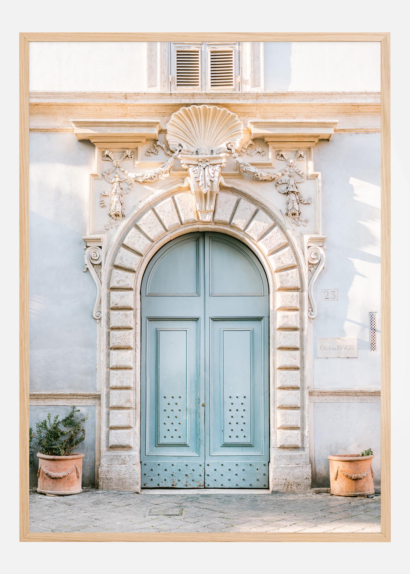 Tämä juliste vangitsee klassisen eurooppalaisen arkkitehtuurin kauneuden ja viehätyksen. Vaaleansininen kaksoisovi on ympäröity tyylikkäällä kivisestä portilla, jossa on hienosti veistettyjä yksityiskohtia ja koristeita, jotka antavat tunteen historiallisesta rikkaudesta ja kulttuuriperinnöstä. Oven yläpuolella on vaikuttava simpukkamuotoinen holvikaari, joka täydentää tätä mahtavaa sisäänkäyntiä. Oven molemmin puolin on ruukut, joissa on vihreitä kasveja, mikä tuo luonnollisen ja eläväisen kontrastin kiviseen julkisivuun. Tämä kuva säteilee rauhallista ja ylevää tunnelmaa, täydellinen tuomaan klassisen kauneuden elementin jokaiseen kotiin.