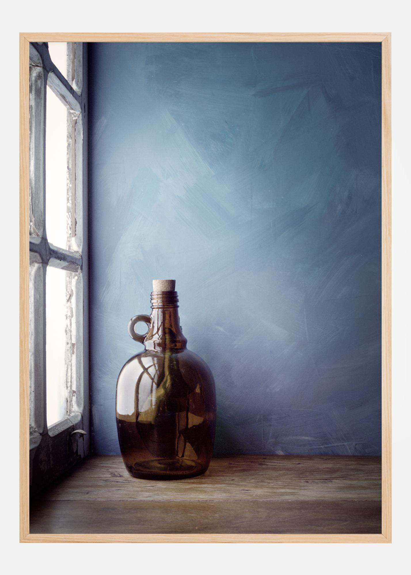 Asetelmajuliste ruskeasta pullosta sinistä seinää vasten. Ikkunan valo paistaa sisään vasemmalta valaisten pulloa ja heittäen heijastuksia. Lisää maalaismaista tunnelmaa kotiisi pehmeän sinisellä seinällä ja vanhalla puupöydällä, jolla pullo on.