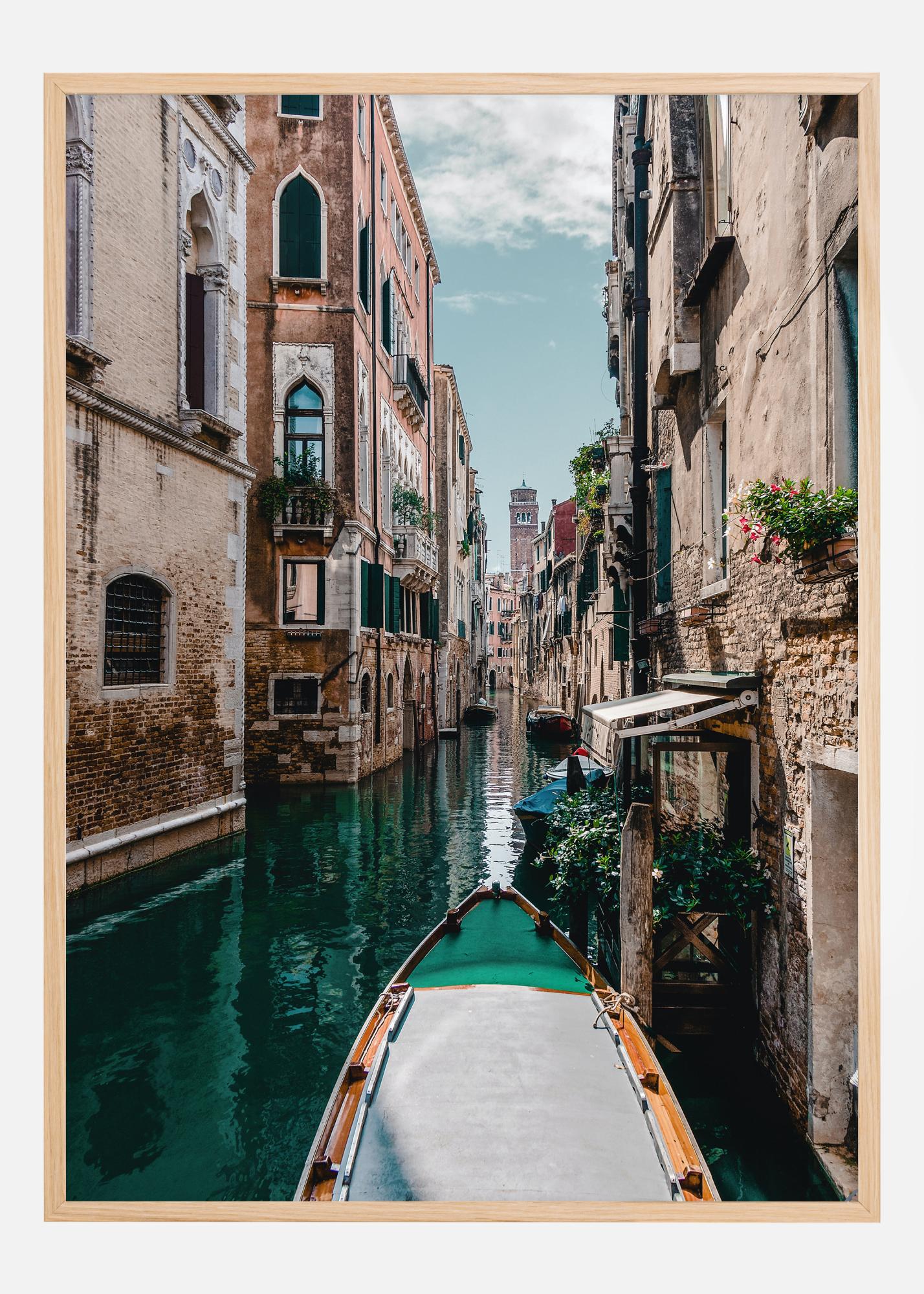 Tämä kiehtova juliste vangitsee Venetsian viehättävän kanavan olemuksen, etualalla perinteinen gondoli. Valo lankeaa kauniisti ympäröivien rakennusten värikkäille julkisivuille, ja hiljaisen veden heijastukset luovat sekä selkeän että lumoavan peilikuvan. Rakennusten muurauksessa olevat maanläheiset punaiset ja oranssit sävyt ovat vastakohtana kanavan rauhalliselle sinivihreälle sävylle.