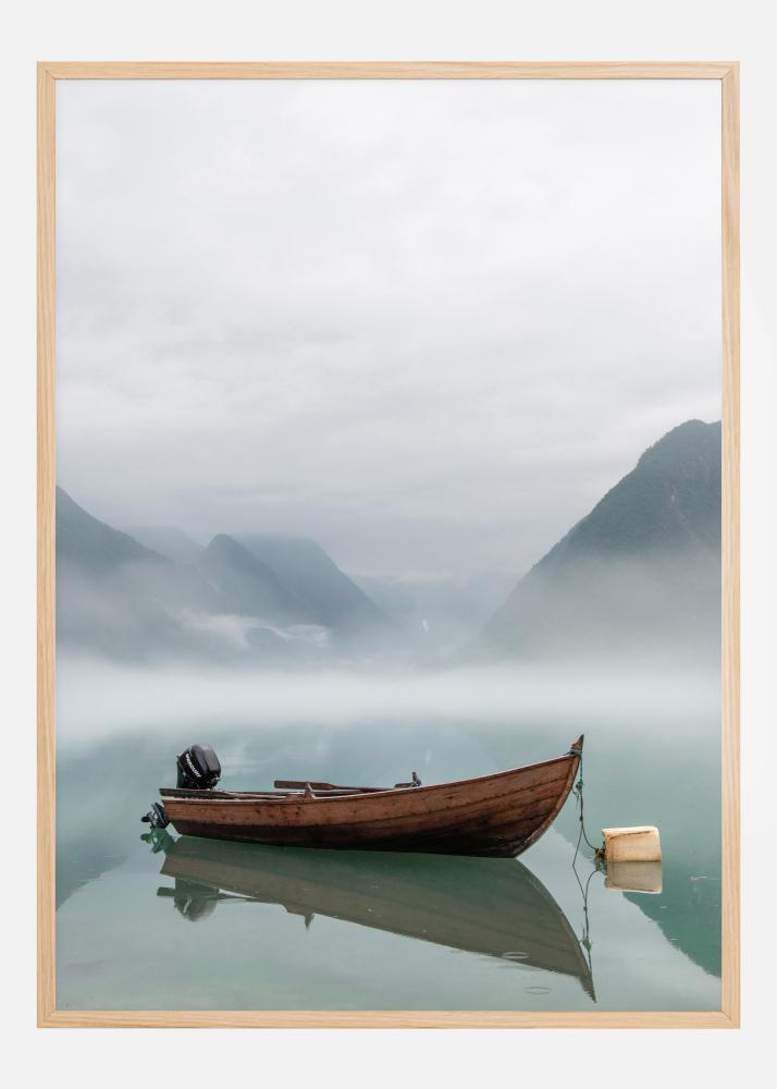 Tyylikäs juliste veneestä keskellä sumuista järveä. Ruskea vene on selkeänä yksityiskohtana etualalla, ja sen heijastus on kirkas veden pinnalla. Taustalle sumun taakse häipyvät vedestä kohoavat pehmeät vuoret. Tuo avoimen tilan rauhallisuus kotiisi.