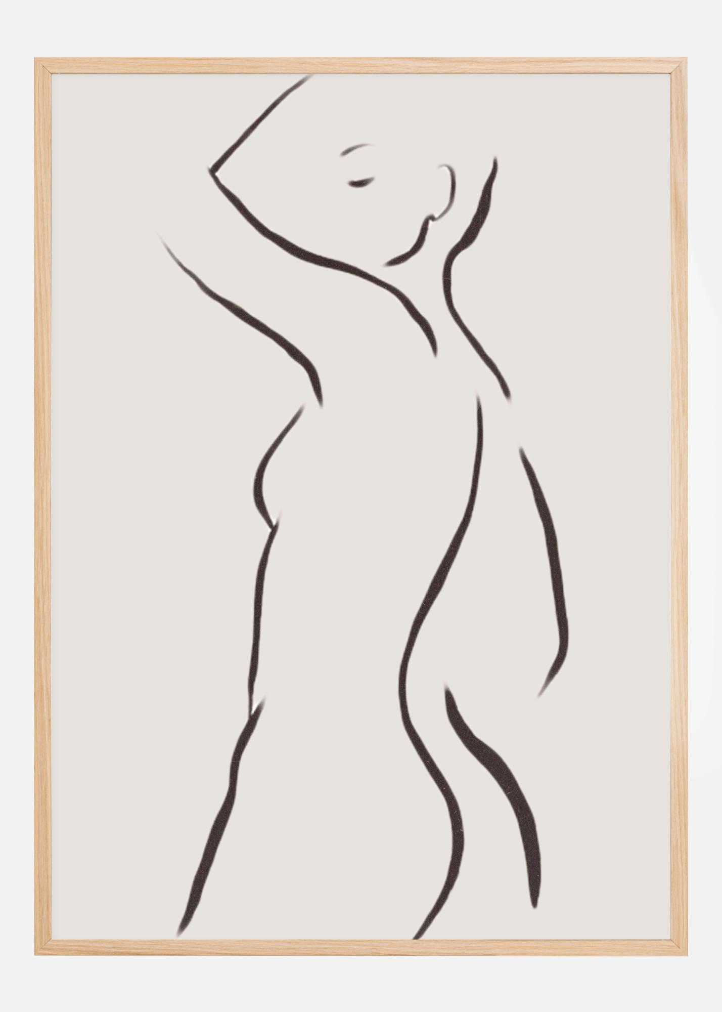 Viivapiirrosjuliste naisesta, joka kurottautuu ylöspäin. Yksinkertaiset siveltimenvedot luovat tämän naisen pään ja vartalon virtaavan muodon, kun hän seisoo vahvana mutta rauhallisena. Alaspäin katsoen hän nostaa vasemman kätensä korkealle. Yhdistä kirkkaan seinän kanssa, jotta viivat korostuvat.