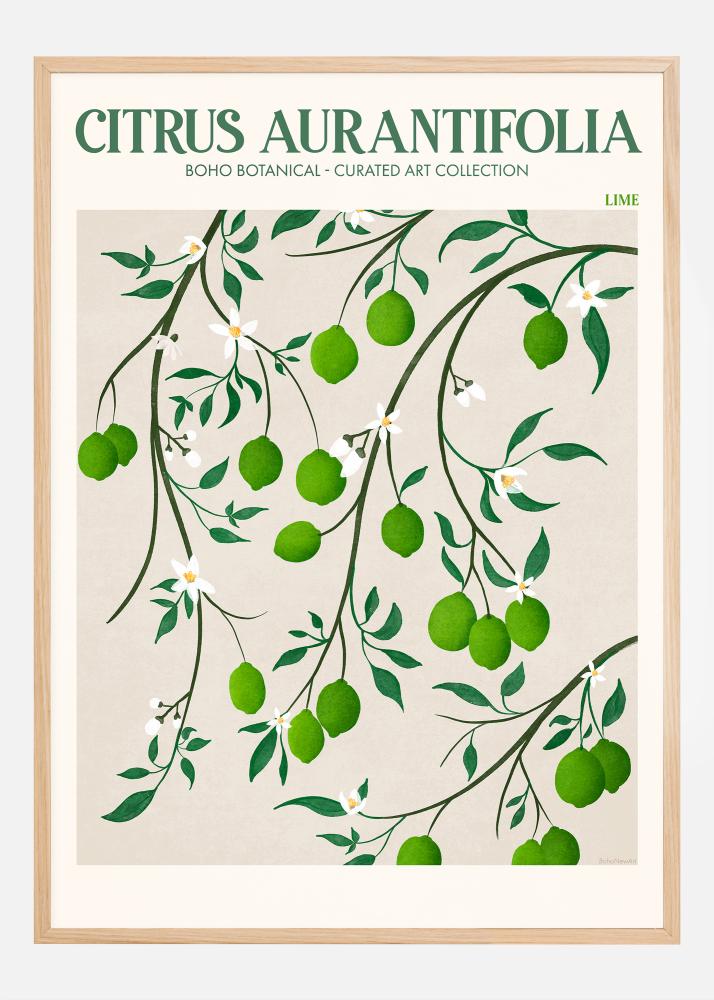 Tämä tyylikäs ja hienostunut juliste esittelee Citrus aurantifoliaa, tunnetummin limeä, osana BOHO Botanical - Curated Art Collection -kokoelmaa. Taideteos kuvaa kauniin vihreitä limettejä roikkumassa haarautuneista oksista, ympärillään pehmeän valkoisia kukkia neutraalilla taustalla. Jokainen elementti tässä julisteessa on huolellisesti valmistettu heijastamaan limetin raikkautta ja elinvoimaa, mikä tekee siitä upean lisän keittiöön tai olohuoneeseen, sekä myös liiketiloihin kuten kahviloihin tai ravintoloihin, jotka arvostavat luonnollista ja orgaanista ilmapiiriä.