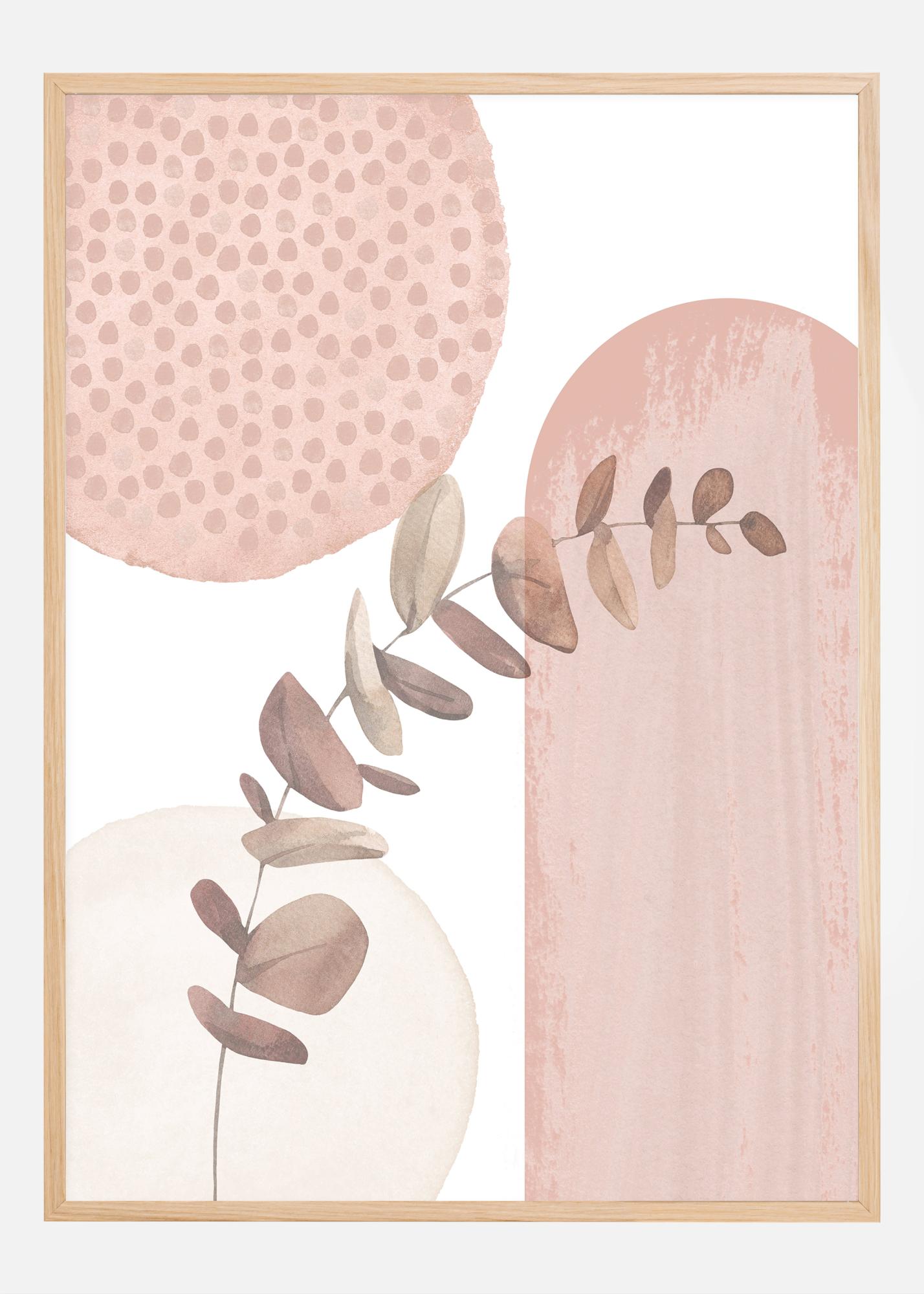 Tämä rauhallinen ja tyylikäs juliste esittää hienostuneen ja minimalistisen kukkakuvituksen miellyttävässä vaaleanpunaisen ja neutraalien sävyjen paletissa. Kuvio, joka näyttää virtaavan useiden abstraktien muotojen yli, on sekä moderni että ajaton. Yksinkertainen kasvinoksa, jossa on eleganssia lehdissä, ulottuu sommitelman yli samalla kun taustalla olevat pyöreät kuviot ja pehmeät värit luovat avaruuden ja syvyyden tuntua. Tämä taideprintti on erinomainen sisustusyksityiskohta kaikille, jotka arvostavat rauhallisia värejä ja hienovaraista muotoilua kodissaan.