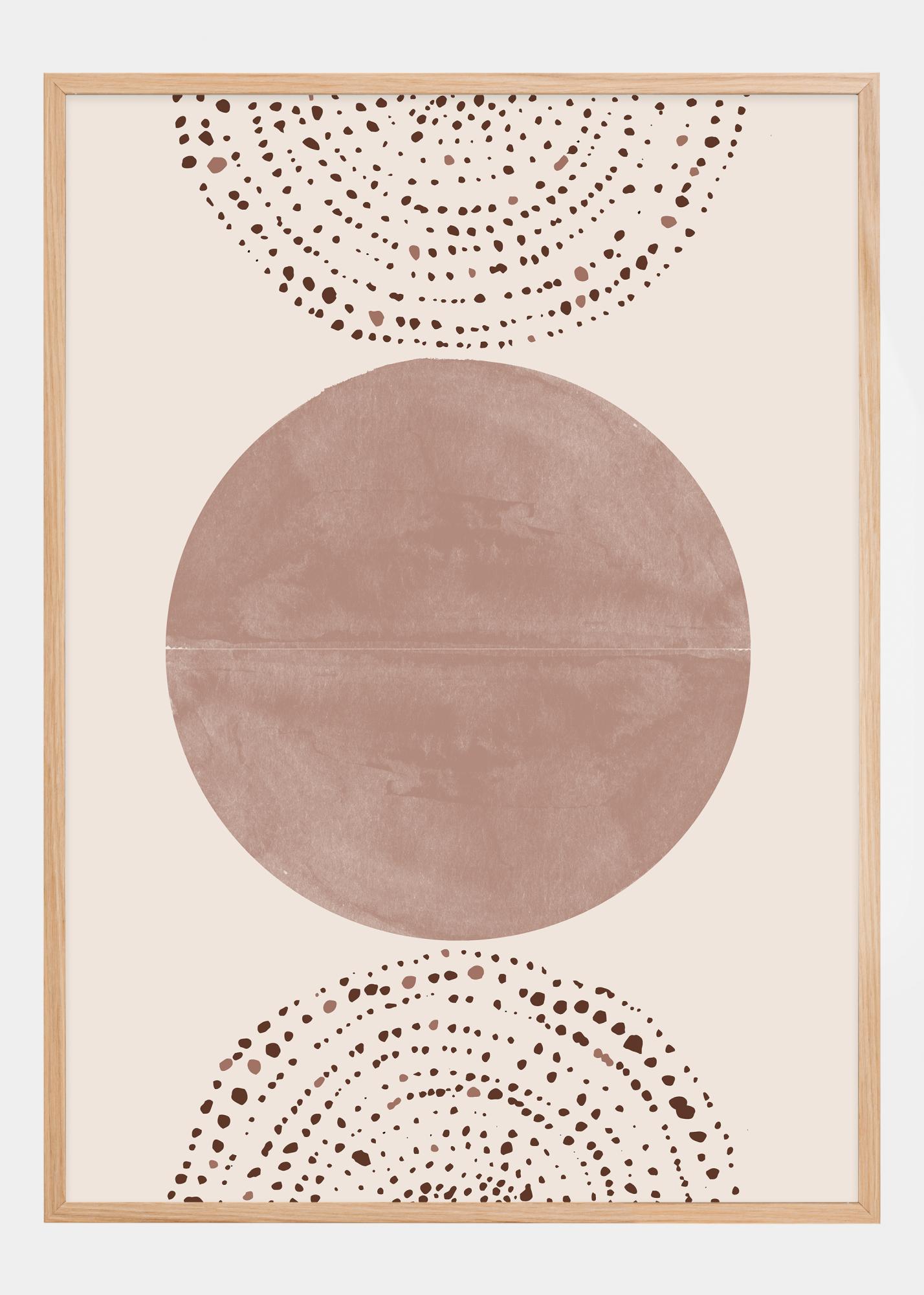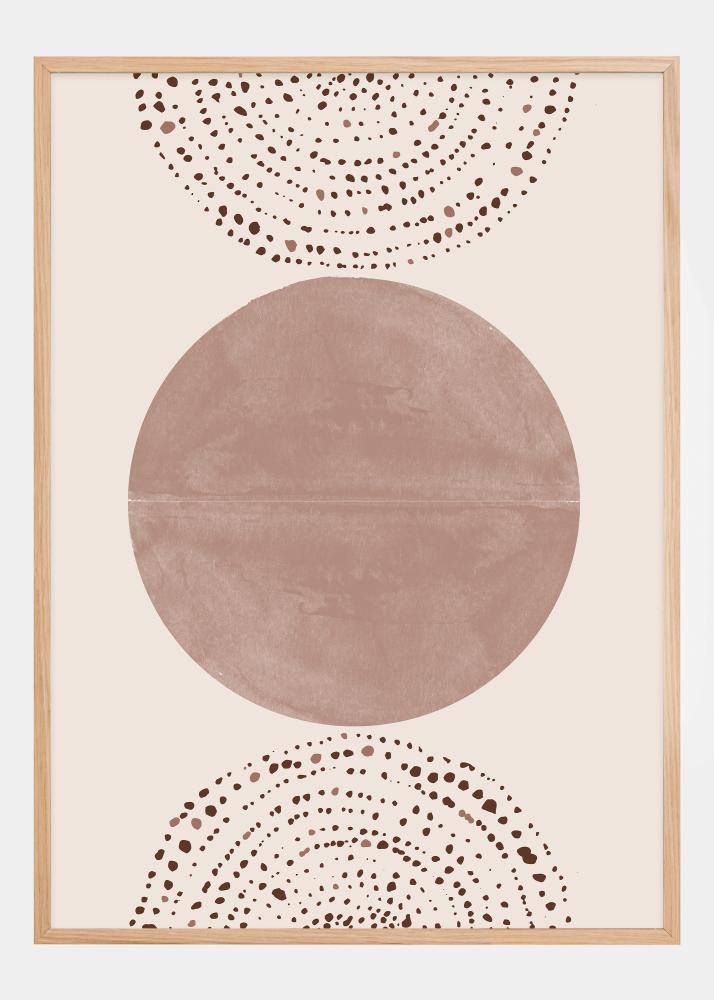 Tämä sofistikoitunut ja rauhoittava juliste korostaa isoa, pehmeää terrakotanväristä ympyrää keskellä sommitelmaa, joka koostuu hienoista, hajautetuista pisteistä, jotka muodostavat leijuvia puolikaaria ylä- ja alapuolelle. Tämä kuvio on inspiroitunut boheemista suunnittelusta ja tuo rennon, maanläheisen tunteen lisäämällä samalla modernia vivahdetta huoneeseen, jota se koristaa.