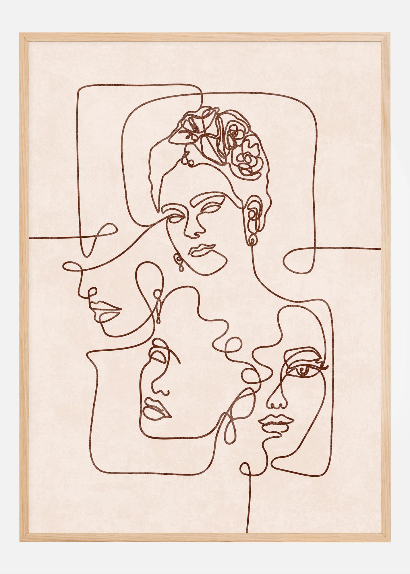 Anna kodillesi taiteellinen lisäys tällä tyylikkäällä julisteella, joka juhlistaa naiseuden kauneutta ja voimaa. Yhdessä, yhtenäisessä linjassa esitetään neljä naiskasvoa kuvastamaan yhtenäisyyttä ja monimuotoisuutta. Jokainen profiili on suunniteltu yksinkertaisuudella, joka puhuttelee katselijan mielikuvitusta, tehden tästä julisteesta täydellisen keskustelun aloittajan. Tyylikäs beige sävy pukee taustaa, kutsuen lämpöön ja pehmeyteen, kun taas ruskeat viivat tarjoavat voimakkaan visuaalisen kontrastin.