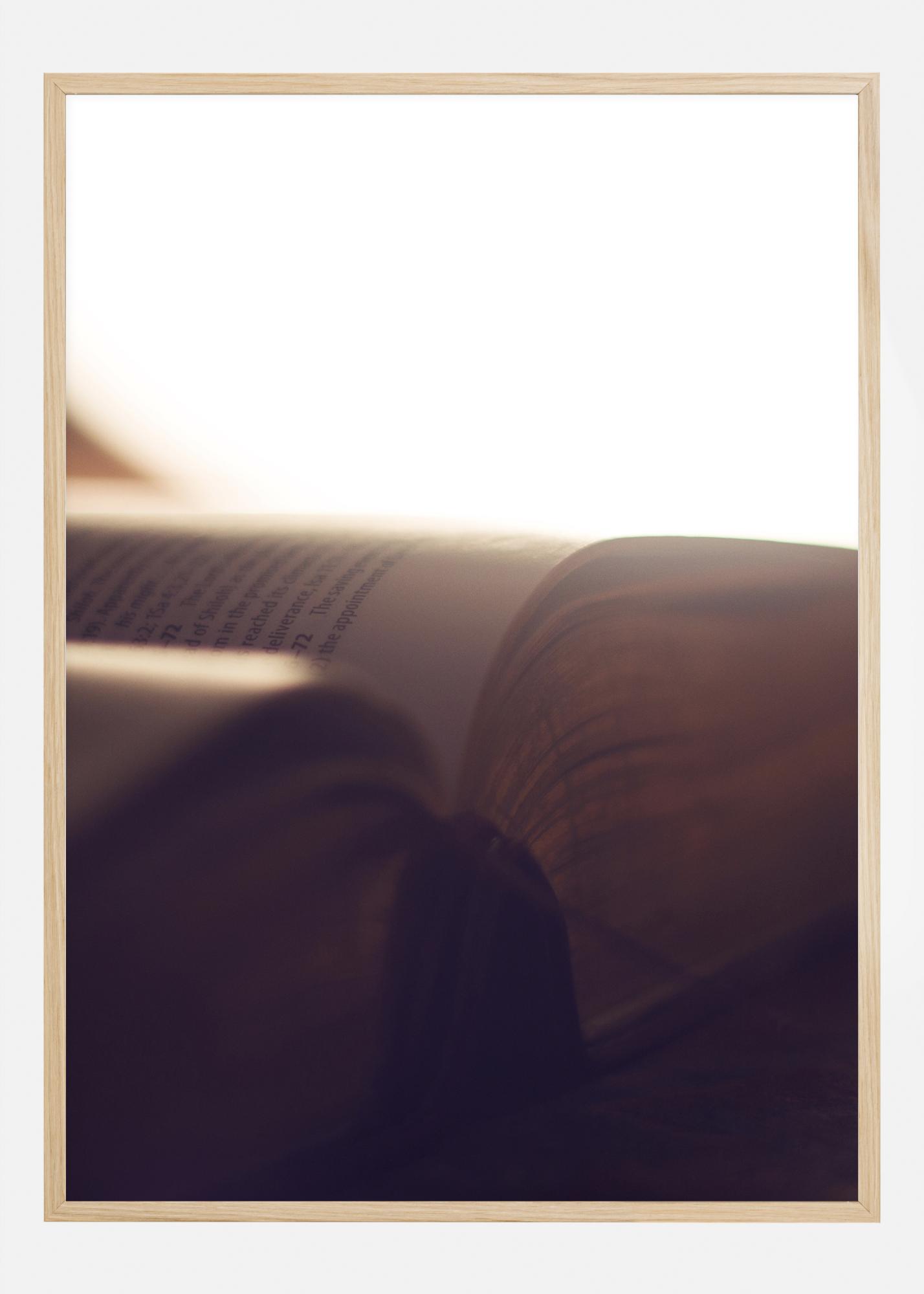 Lähikuvajuliste kirjan sivusta. Kirkas valkoinen valo täyttää suurimman osan tästä kuvasta, kun se paistaa alas kirjaan ja valaisee sivujen kullattuja reunoja. Kirja kaartuu auki, ja sanat näkyvät juuri ja juuri sivulla. Se on täydellinen vedos työhuoneeseen.