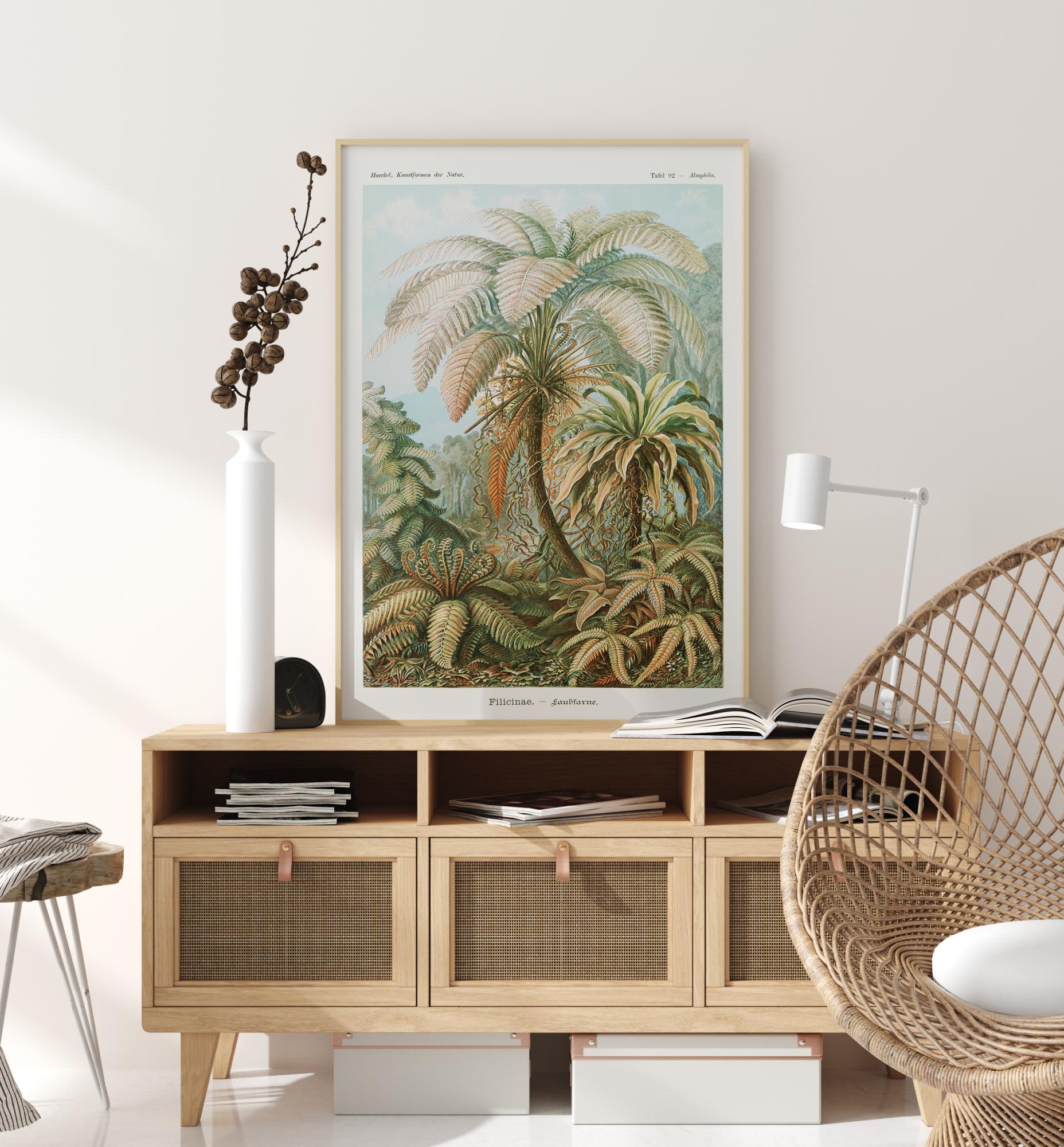 Kuvitusjuliste erilaisista kasvitieteellisistä kasveista. Suuret palmunvarret ja saniaiset versovat tämän kuvan läpi. Vihreät, siniset ja oranssit sävyt luovat pehmeän sävyn tähän antiikkiseen saksalaiseen tieteelliseen piirrokseen. Tuo ripaus vanhaa kotiisi näiden kasvien ja niiden latinankielisten nimien avulla.
