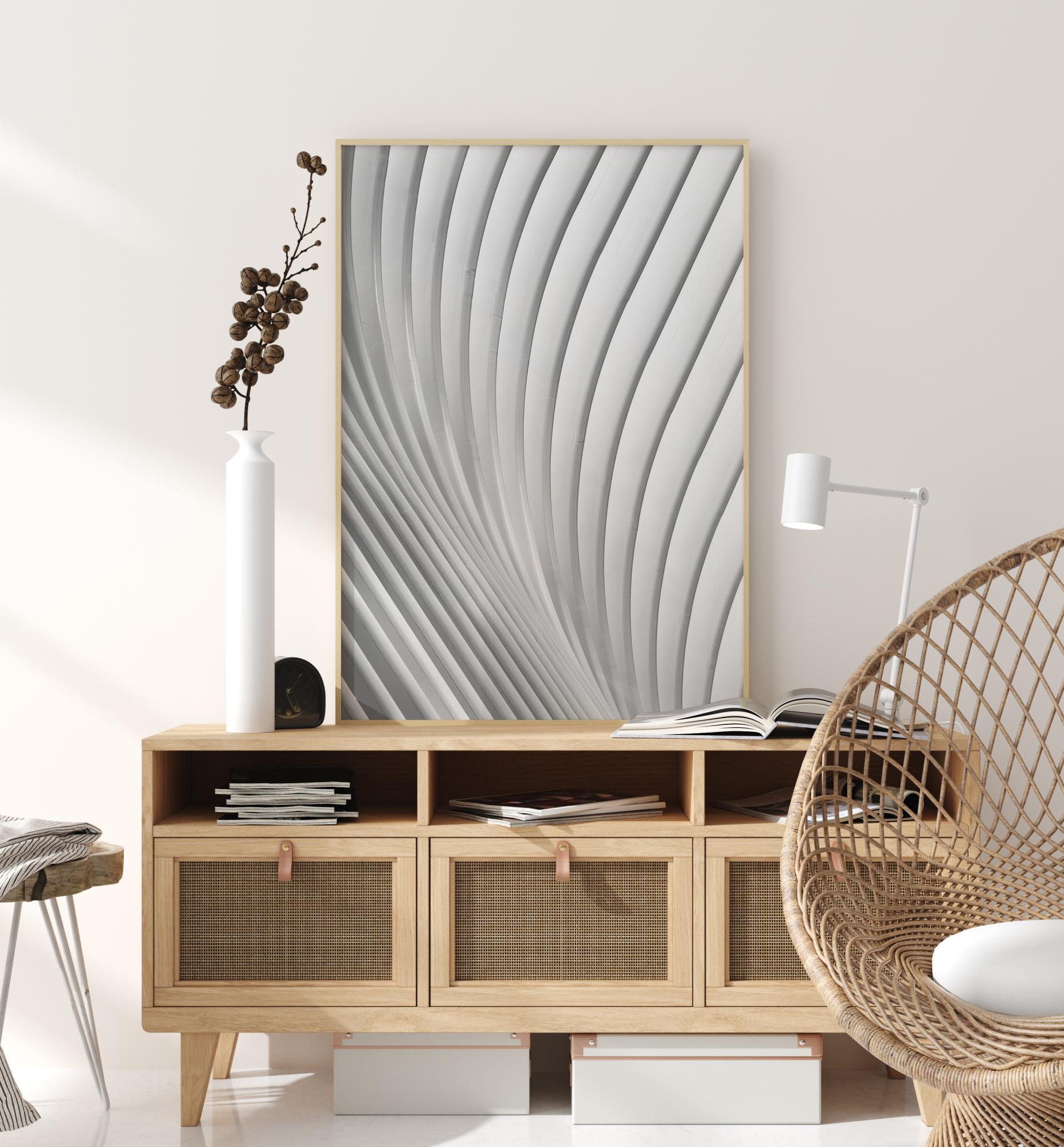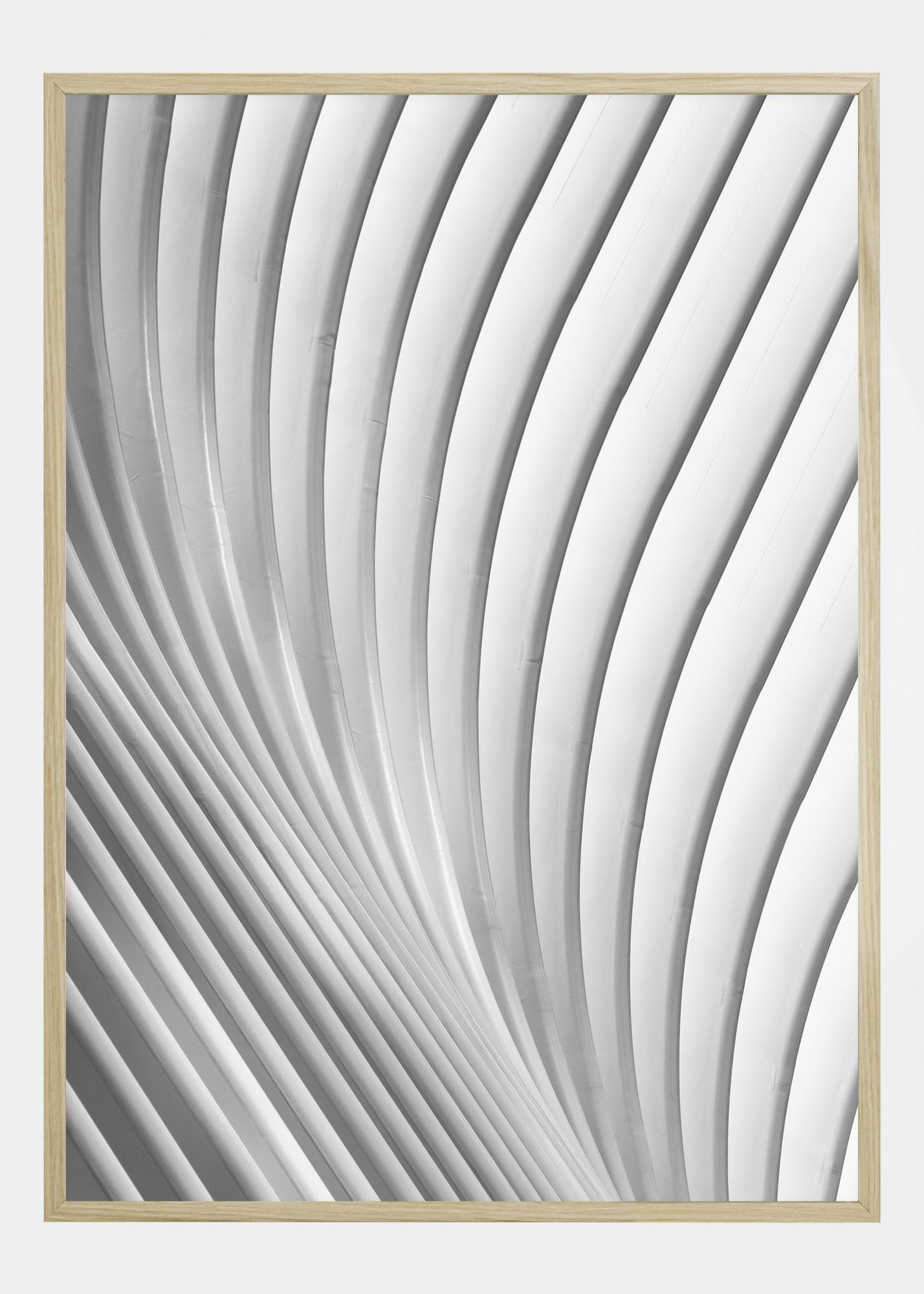 Abstrakti juliste, jossa valkoiset ja harmaat viivat aaltoilevat kuvan poikki. Viivat alkavat oikeasta alakulmasta ja kaartuvat loivasti ylöspäin ennen kuin ne kaartuvat oikeaan yläkulmaan. Vaikka kuva on yksinkertainen, se kiinnittää huomion, kun annat silmiesi rentoutua ja seurata viivojen virtausta.