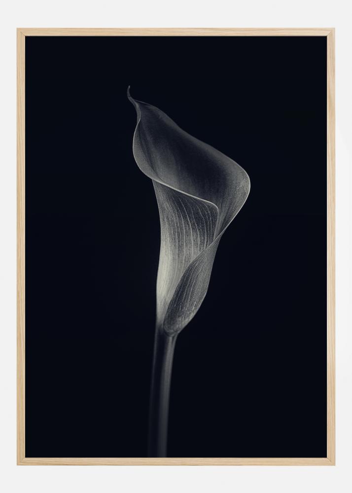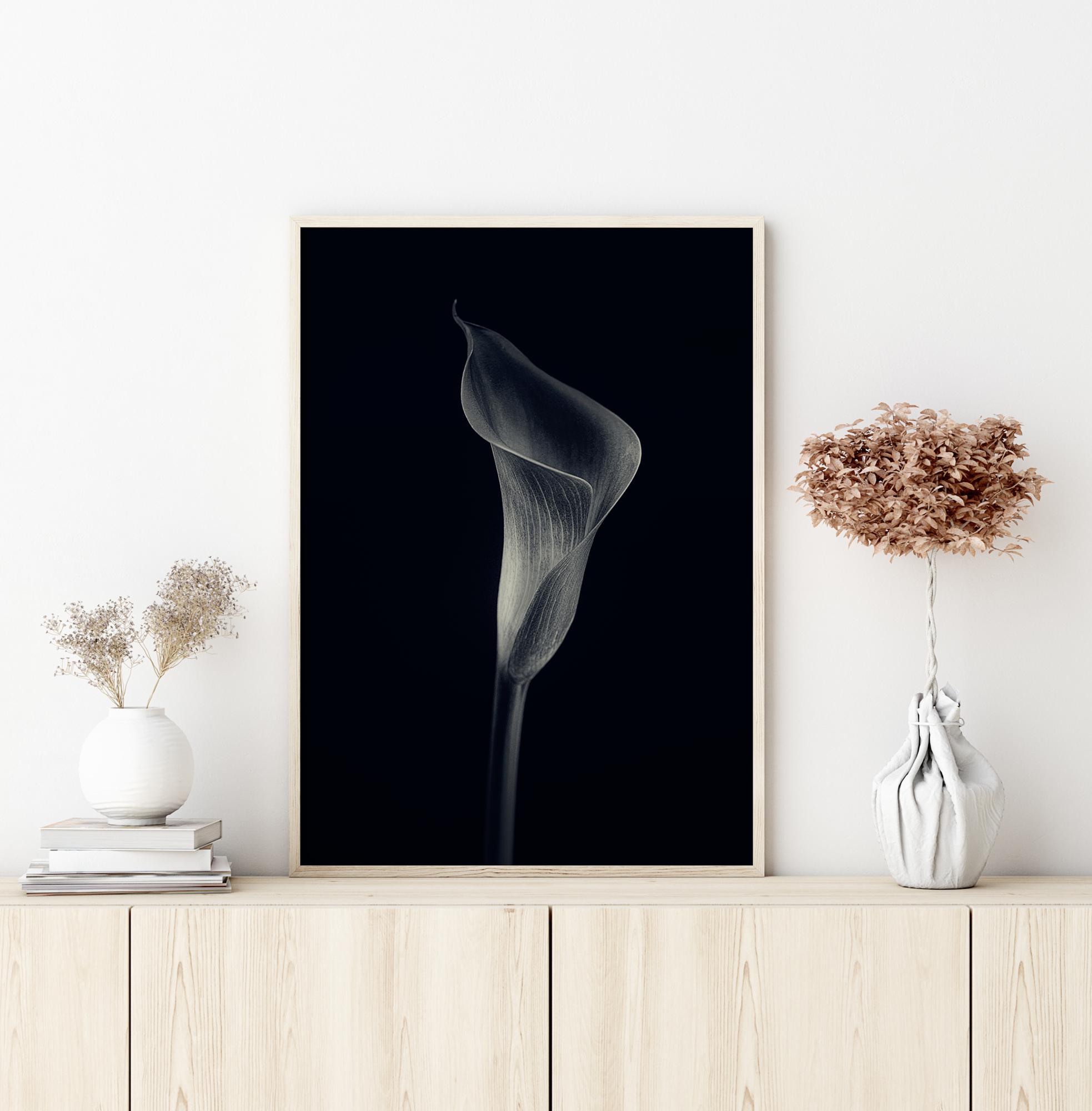 Yksittäinen kuva Callaliljasta julisteessa luo eteerisen hehkun. Tämän liljan käänteisnegatiivi antaa kukalle mystisen luonteen mustaa taustaa vasten. Tämä epätavallinen valokuva Callaliljasta herättää varmasti keskustelua, kun ripustat sen valkoiselle seinälle dramaattisen vaikutuksen aikaansaamiseksi.
