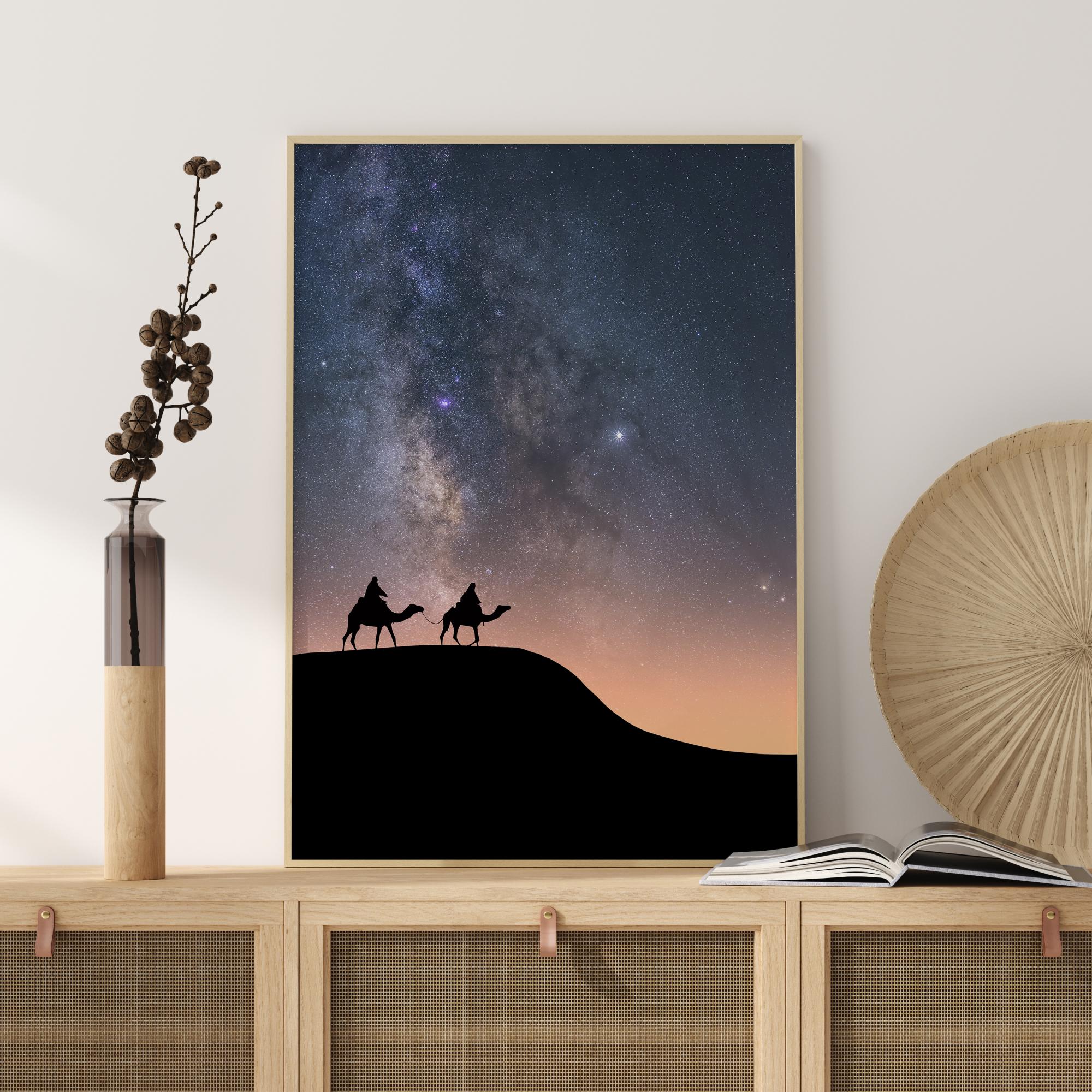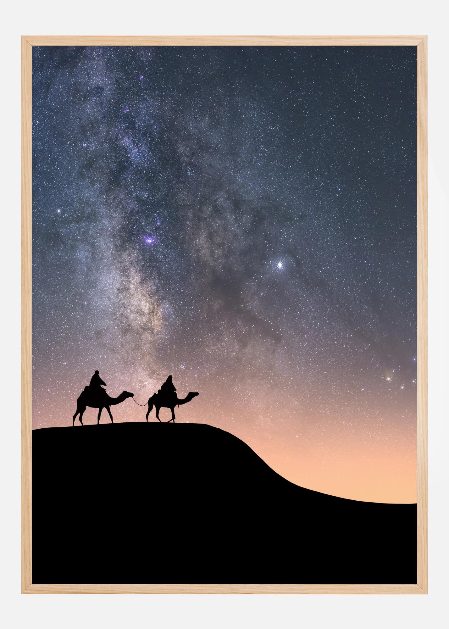Dramaattinen juliste kahdesta kamelista tähtitaivaan alla. Linnunrata hehkuu kirkkaana, kun kaksi kamelia ja ratsastajat siluettina kävelevät tähtien alla tässä eeppisessä otoksessa. Pehmeän oranssi auringonlasku on tässä synnyinseudun tyylisessä kohtauksessa. Matkusta kaukaiseen paikkaan, kun ripustat tämän taianomaisen kohtauksen kotiisi.
