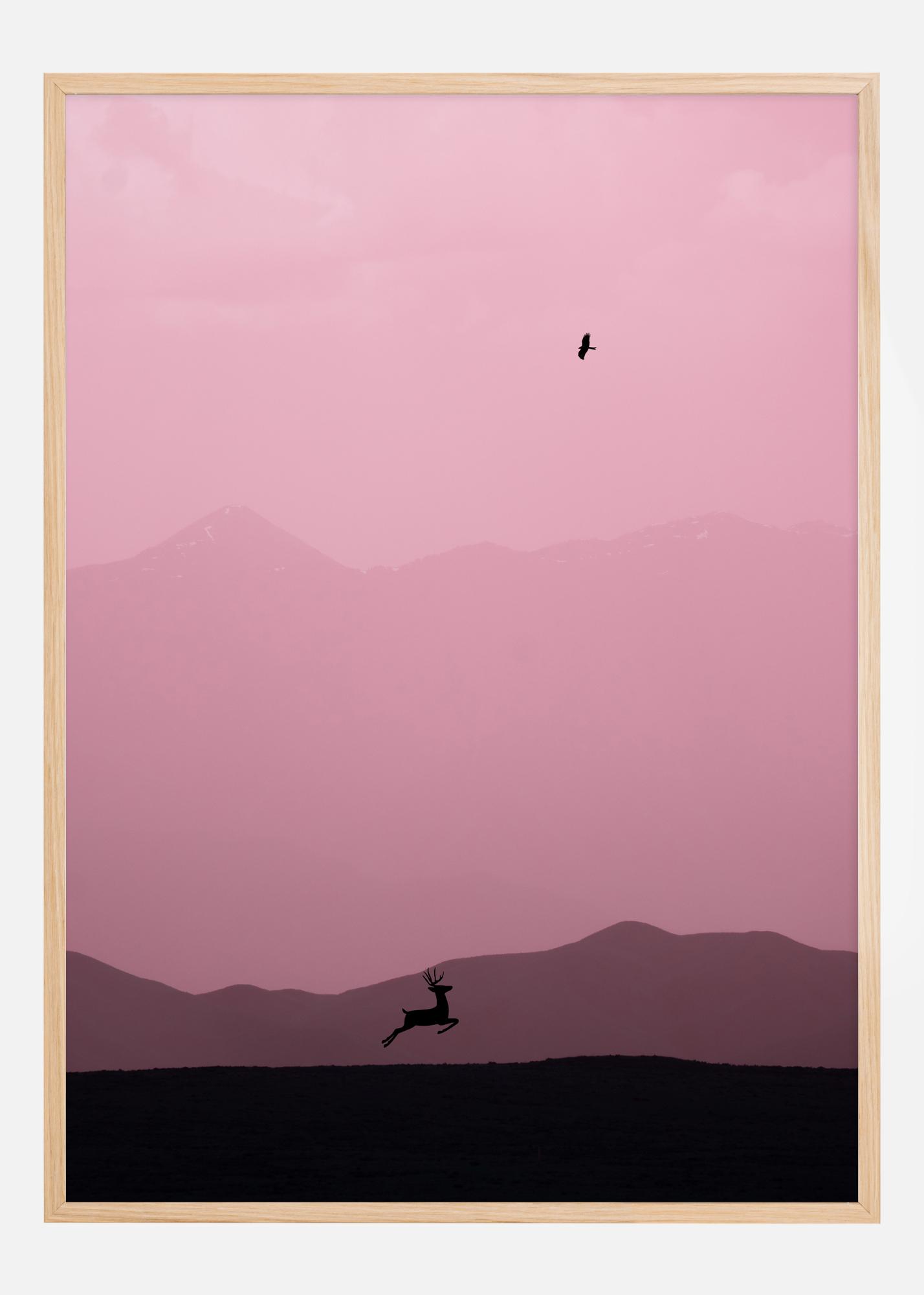 Tämä hiljainen ja unelmainen juliste vangitsee luonnonvapauden ja kauneuden olemuksen. Siluetti hirvestä hypyssä pehmeästi aaltoilevien kukkuloiden siluettia vasten luo tunteen liikkeestä ja keveydestä. Yllä levittäytyy pehmeän vaaleanpunainen taivas, joka tuo kuvaan lämpöä ja ihmetystä. Yksinäinen lintu lentää kohti taivaan äärettömyyttä, mikä tuo kuvaan lisäulottuvuuden vapaudesta ja sidoksettomuudesta.