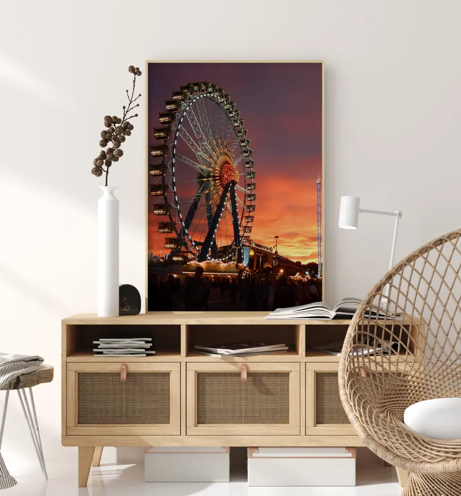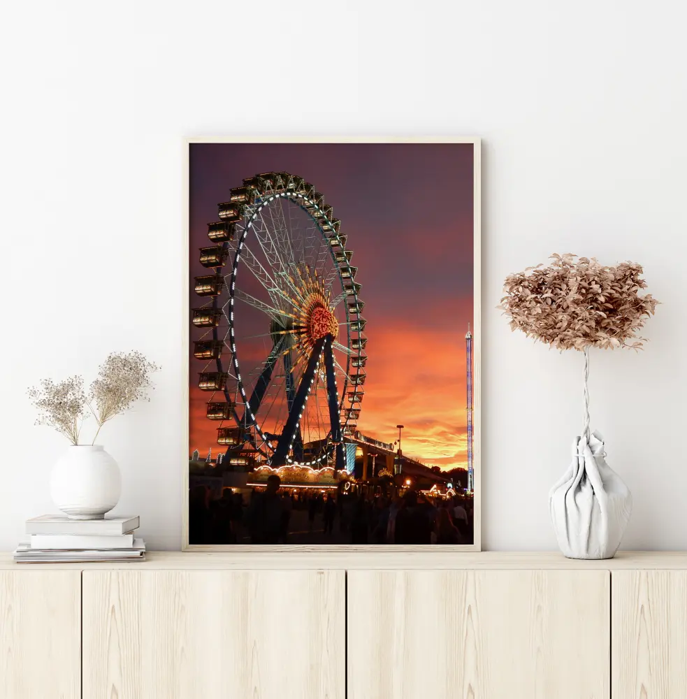 Upea juliste maailmanpyörästä yöllä. Vasemmalla pyörä on valaistuna ja hehkuvana. Alapuolella ihmisjoukot katselevat pyörää auringon laskiessa upealla oranssin ja violetin värisellä yötaivaalla. Tuo seinillesi yöllistä draamaa tällä julisteella.