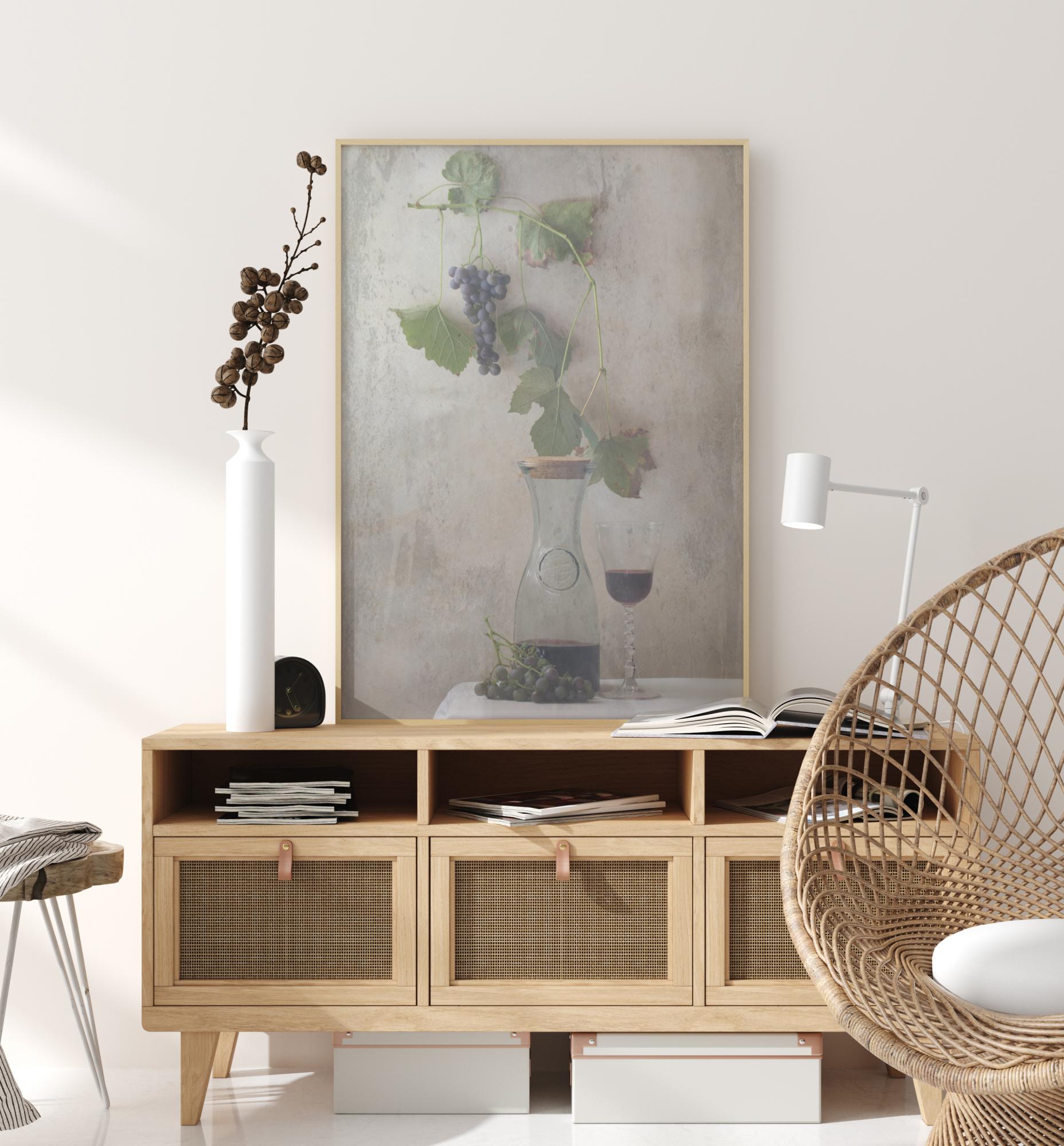 Asetelmajuliste, jossa on karahvi kotitekoista viiniä, viinilasi ja pieni viiniköynnös. Tummanvioletit viinirypäleet ja vihreät lehdet on asetettu yksinkertaisen harmaalle seinälle, mikä saa ne erottumaan. Vie itsesi roomalaiseen huvilaan, kun tuot tämän tyylikkään ja yksinkertaisen teoksen kotiin.