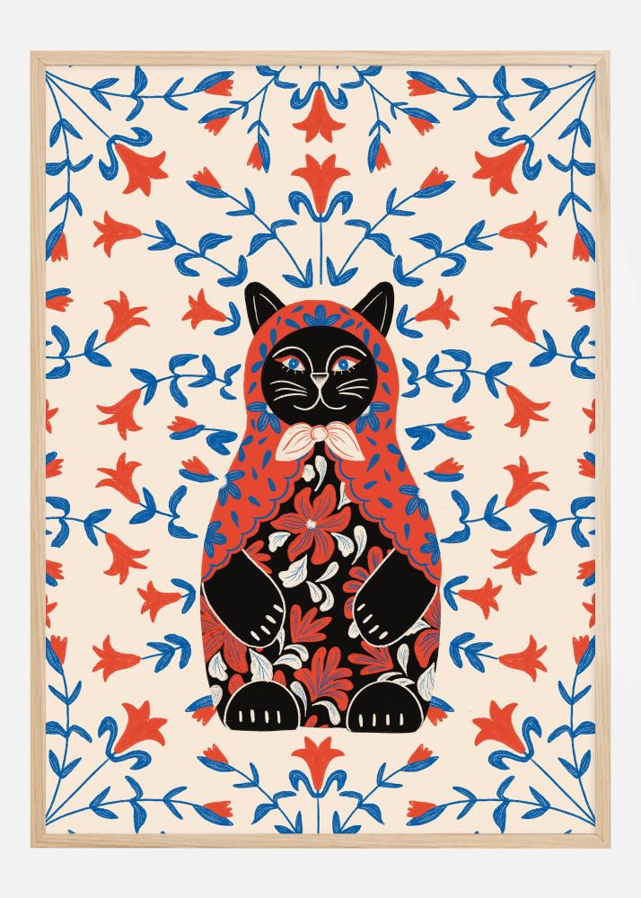 Tämä värikäs ja elävä juliste on moderni tulkinta klassisesta venäläisestä matrjoškasta, joka on uudelleenkuvitettu majesteettisena kissahahmona istumassa keskellä vehreää kukkapuutarhaa. Kissan katse on läpitunkeva ja mystinen, kun taas sen turkki on rikkaasti koristeltu monimutkaisilla kukkakuvioilla. Kissan ympärillä levittäytyy punaisen ja sinisen kukkien meri kermaisen taustan päällä, mikä luo lähes hypnoottisen kuvion, joka on sekä kiehtova että kaunis.