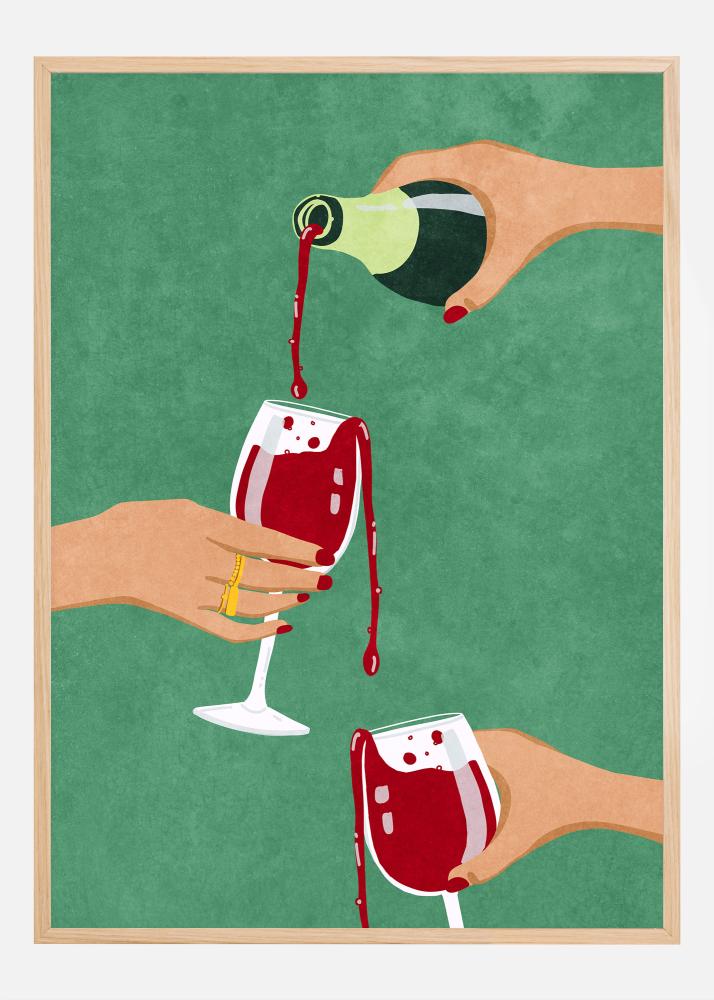 Tämän julisteen värit ovat lämpimiä ja kutsuvia, ja viinin muodostaa rikas punainen sävy, jota täydentävät ihon sävyt ja vihreä tausta, jotka lisäävät syvyyttä ja kontrastia. Tämä väritys tekee kuvasta upean sisustuselementin, joka voi lämmittää minkä tahansa huoneen tunnelmaa. Julistetta ympäröi puinen kehys (kehys ei kuulu kuvioon), joka vahvistaa kuvan välittämää lämmintä ja kutsuvaa tunnetta. Täydellinen ostos viinin ystävälle tai lahjaksi ystävälle, joka arvostaa taidetta ja hyviä hetkiä yhdessä.