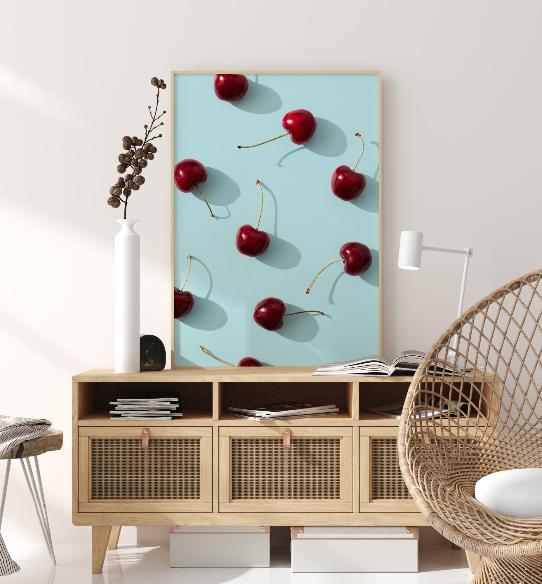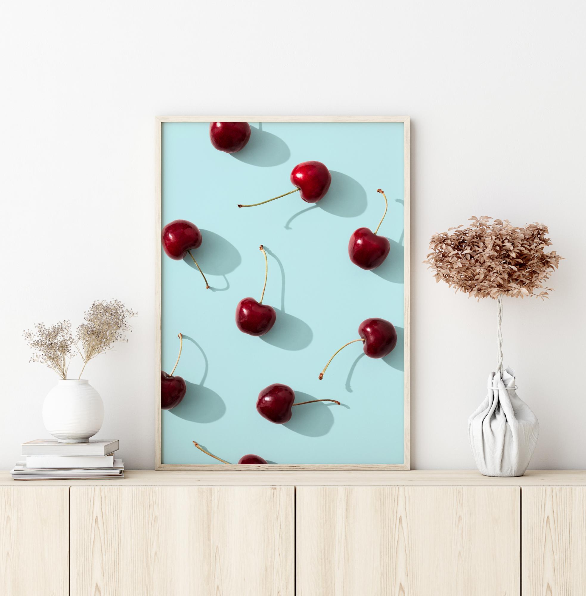 Hedelmäjuliste, jossa kahdeksan kirsikkaa on pehmeällä sinisellä taustalla. Kirkkaanpunaiset kirsikat ja niiden varret heittävät varjoja yksinkertaiselle turkoosille pöytälevylle, jossa ne ovat. Muistuta itseäsi viidestä päivässä, kun ripustat tämän mehevän kuvan keittiöön.