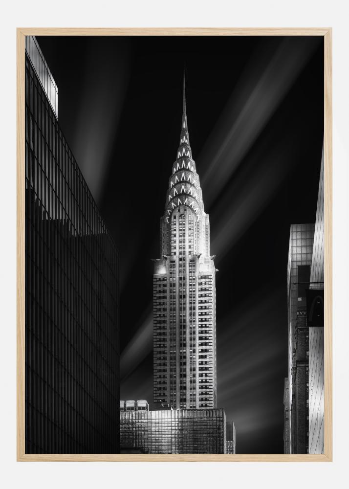 Yöllinen juliste valaistusta Chrysler Buildingista New Yorkissa. Chrysler-rakennus on kuvan keskellä mustaa taivasta vasten. Valkoiset valonsäteet raidoittavat taivasta ja lisäävät kulmia ja dramaattisuutta. Tee rohkea kannanotto tällä dramaattisella mustavalkokuvalla.