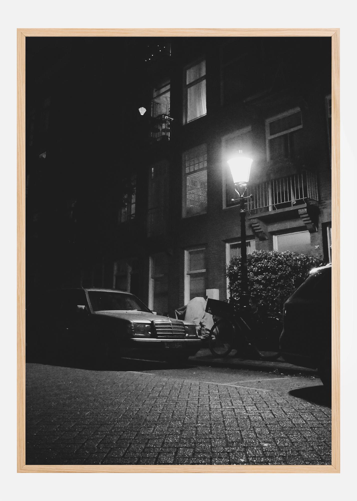 Tämä kiehtova juliste tarjoaa pilkahduksen kaupunkielämästä yön laskeutuessa. Yksinäinen katulamppu kylvettää jalkakäytävän ja pysäköidyt autot pehmeässä, lämpimässä valossa. Aihe on vangittu mustavalkoisessa paletissa, joka korostaa tämän hiljaisen kaupunkikuvan kontrasteja ja yksityiskohtia. Tämä painatus on täydellinen tuomaan rauhallisuutta ja pohdintaa mihin tahansa huoneeseen ja muistuttaa kaupungin muuten sykkivän tahdin rauhallisista hetkistä.