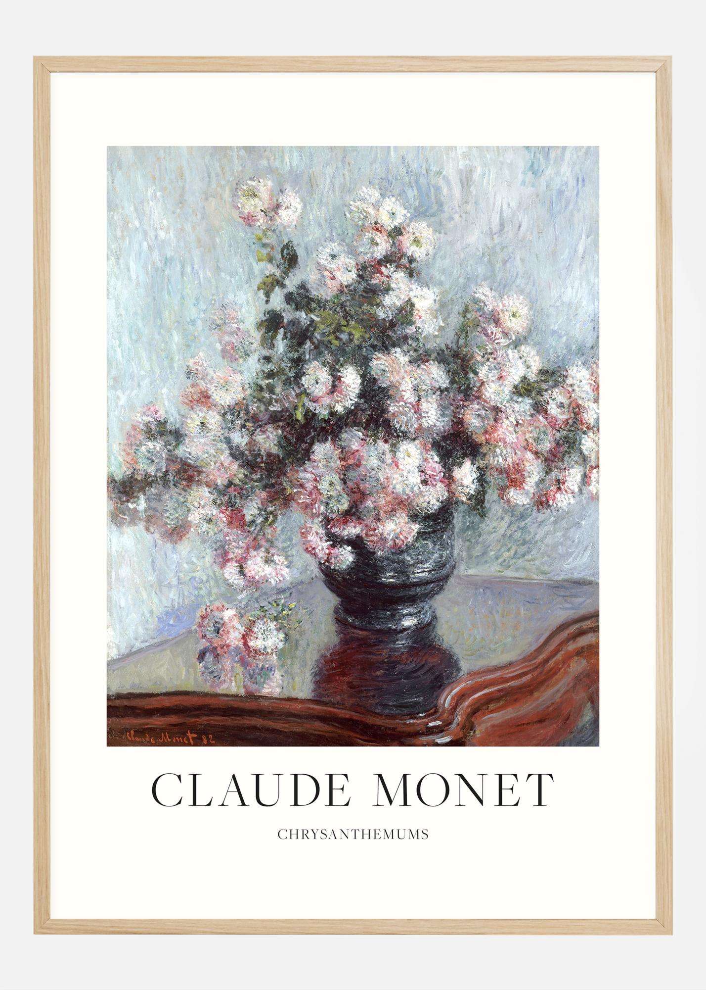 Ihaile Claude Monet'n 'Krysanteemit' teoksen syvyyttä ja tekstuuria, juliste joka ilmaisee hänen ainutlaatuisen kykynsä vangita luonnon olemus. Tämä herkkä esitys krysanteemista maljakossa on osa Monet'n laajempaa teossarjaa, joka juhlistaa kukkien kauneutta. Maalaus, joka on päivätty vuoteen 1892, välittää kukkien pehmeyden ja vaihtelevat värit impressionistisella tekniikalla, mikä luo katsojalle lähes unenomaisen tilan. Väripaletti on tasapaino herkkiä vaaleanpunaisia ja valkoisia sävyjä vasten tunnelmallista sinistä taustaa, mikä luo rauhan ja kauneuden tunteen.