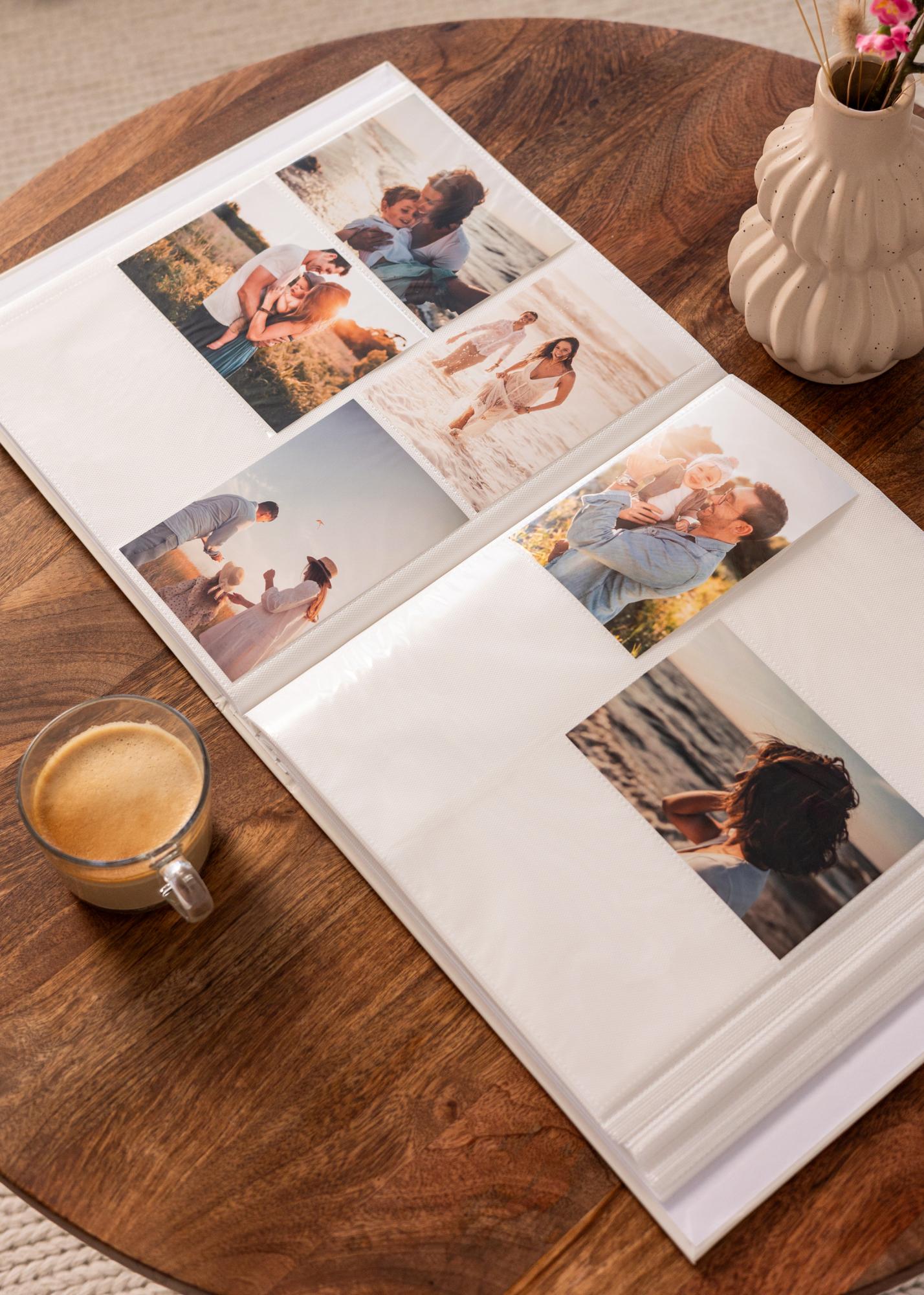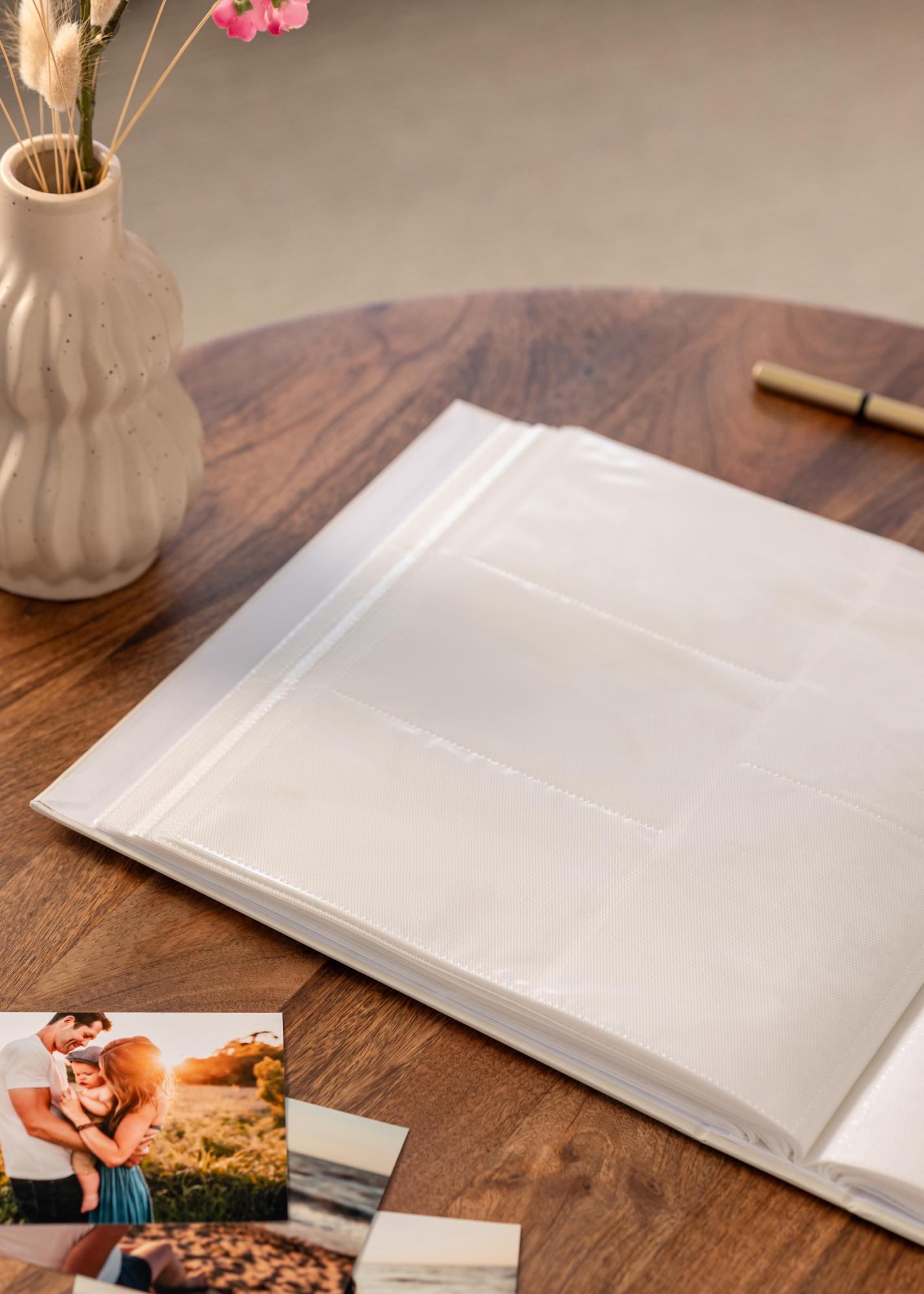 Albumin kannet ovat hienostuneessa harmaassa sävyssä, joka antaa ajattoman ja modernin vaikutelman. Valkoiset sivut luovat kauniin kontrastin ja korostavat kuviasi parhaalla mahdollisella tavalla. Jokaisessa sivussa on käytännölliset taskut, mikä tekee kuvien kiinnittämisestä ja vaihtamisesta helppoa ilman vaivaa.
