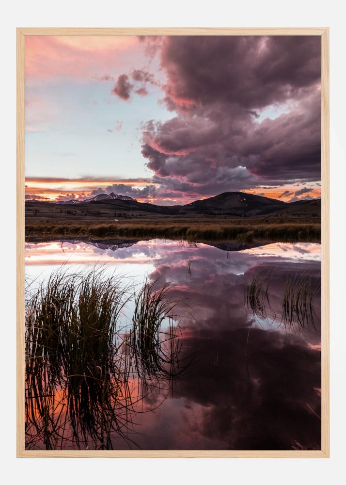Maisemallinen juliste järvestä, jossa on kaislikoita ja upeita pilviä horisontissa. Ruoko heiluu järvessä tuulessa, kun suuret purppuranpunaiset pilvet vyöryvät yläpuolella ja heijastuvat järven tyyneen pintaan. Kaksi pilviviivaa vetää katseesi horisonttiin ja laskevan auringon punertavaan sävyyn. Nauti tämän vahvan pastellisävyisen teoksen dramaattisuudesta.