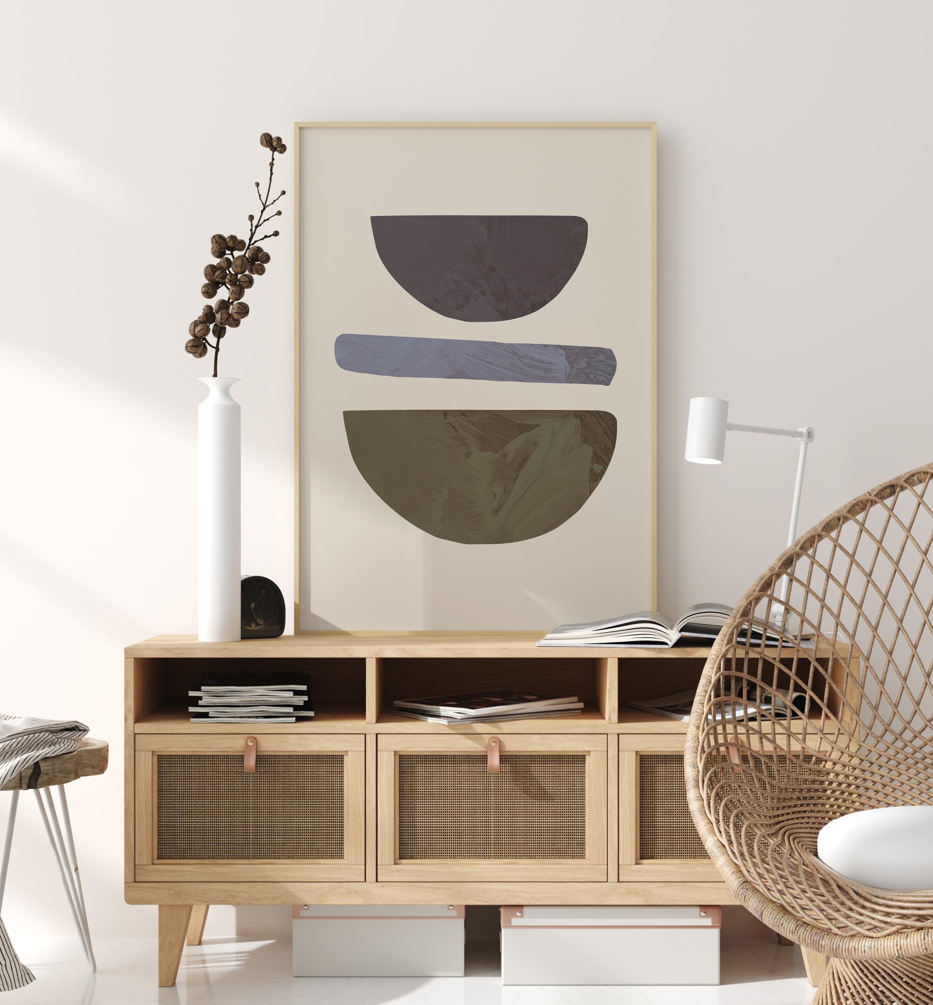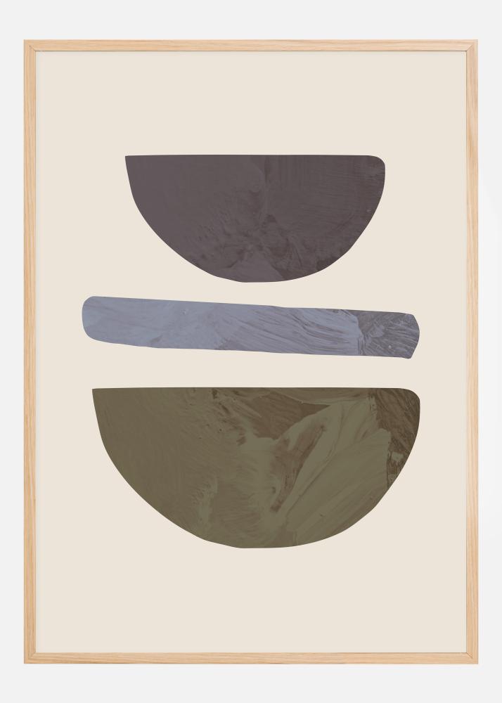 Abstrakti juliste, jossa on kolme eri muotoa ja väriä. Pohjalla on ruskea puoliympyrä, jonka keskellä on vaaleansininen palkki. Yläpuolella on tummanharmaa puoliympyrä, kaikki valkoisella pohjalla. Lisää tämä tavalliselle seinälle, niin saat upean keskustelunaiheen.