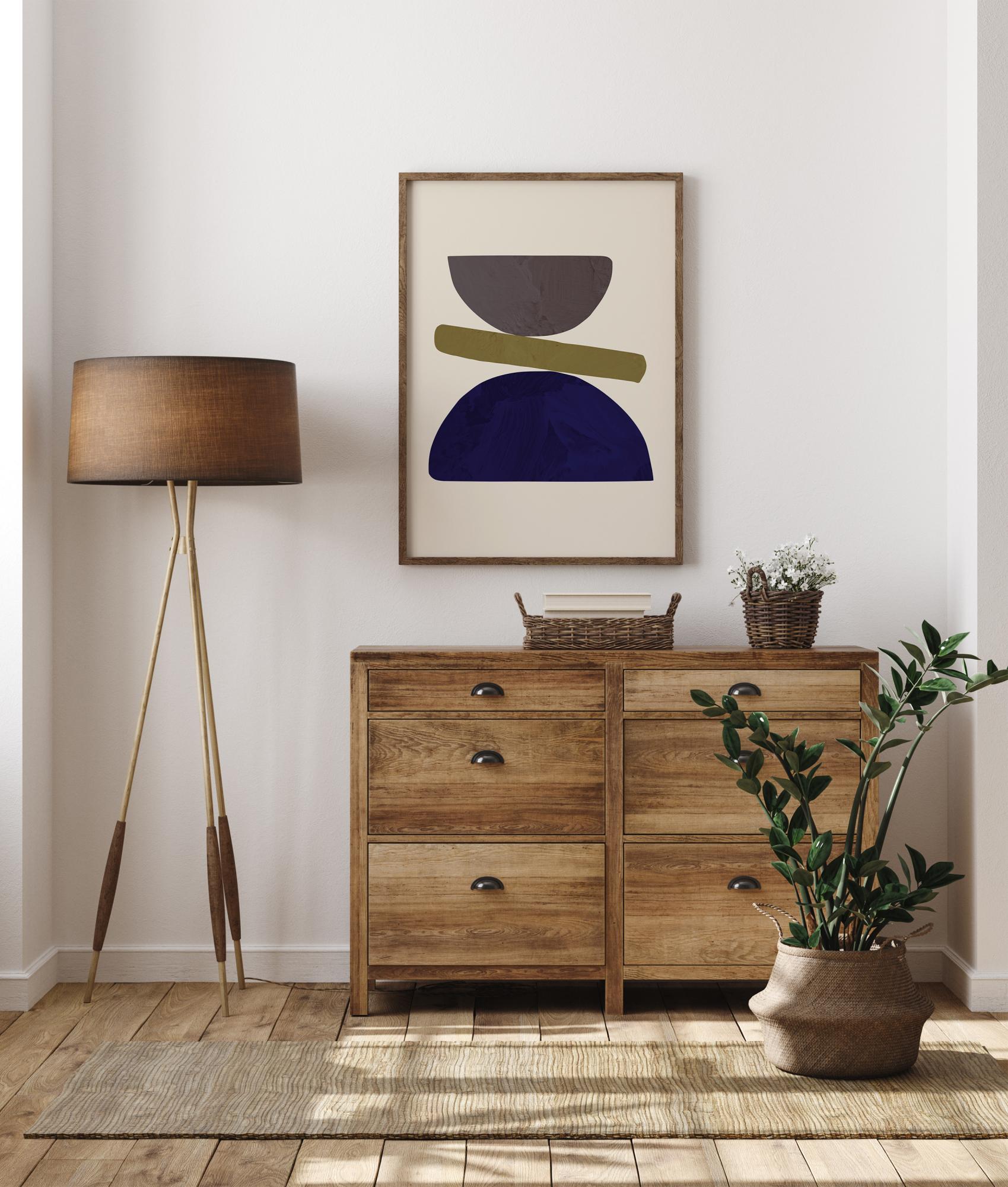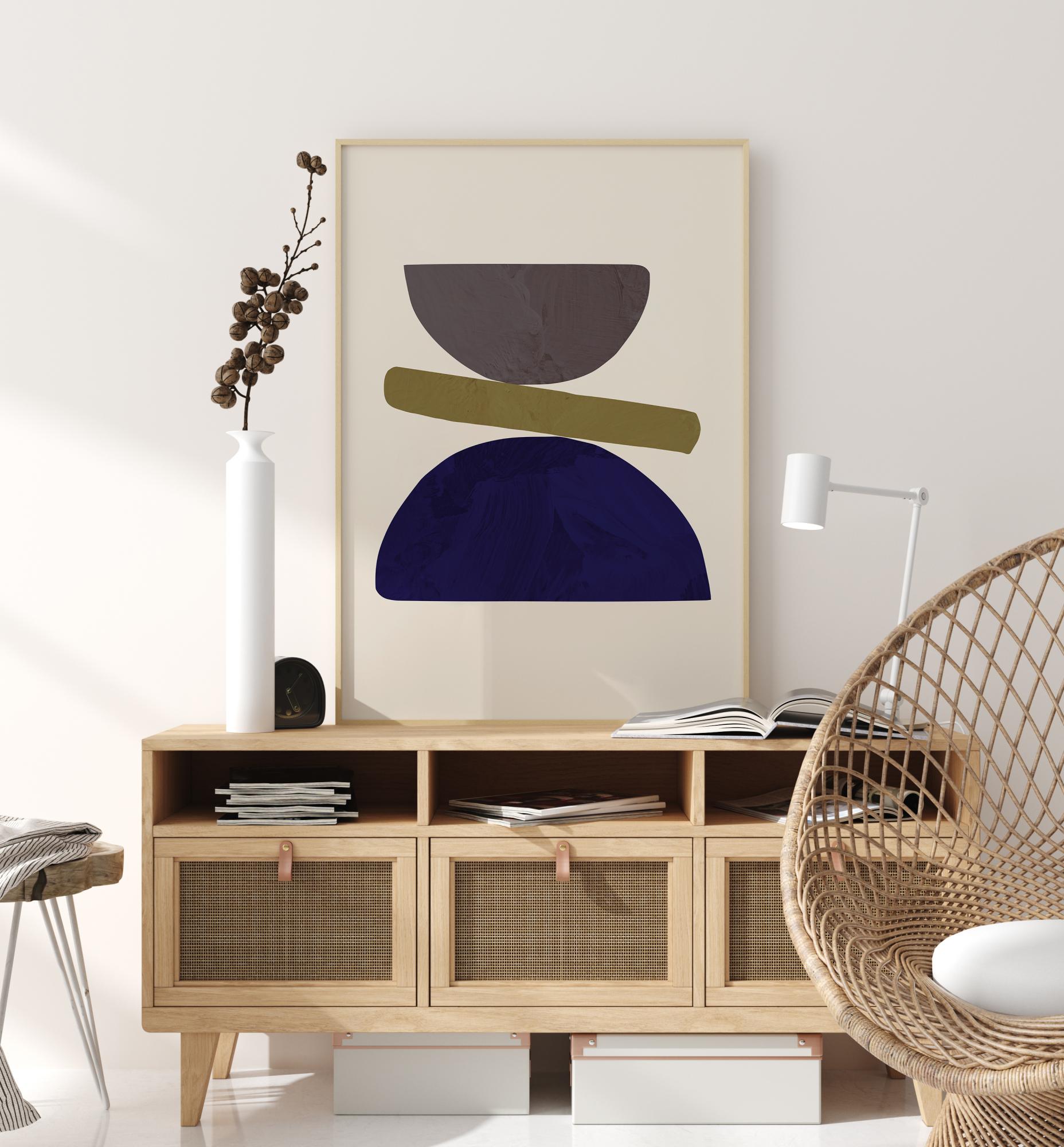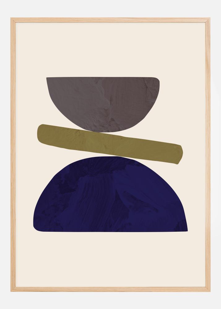 Juliste tasapainosta geometrian avulla. Suuri sininen puoliympyrä tasapainottaa ohutta vihreää pitkulaista muotoa sen kaarella. Sen päällä harmaa puoliympyrä tasapainottaa tiimalasin muotoa. Vietä tuntikausia katsellen tätä teosta löytääkseen sen sisällä olevat muut muodot.