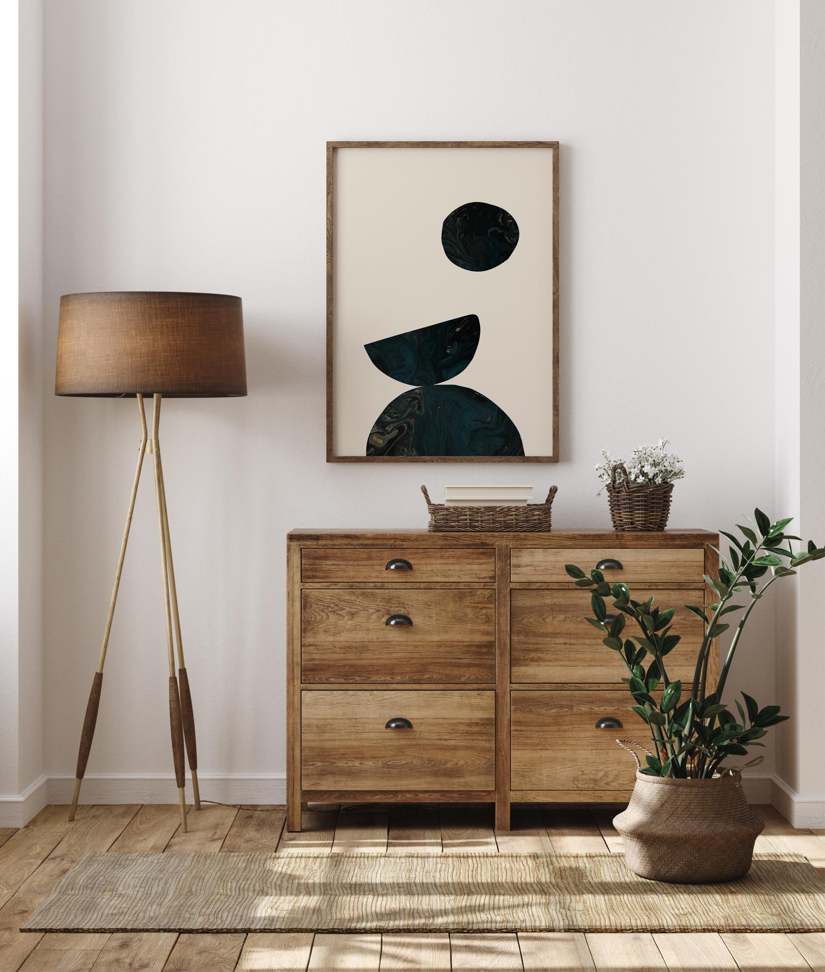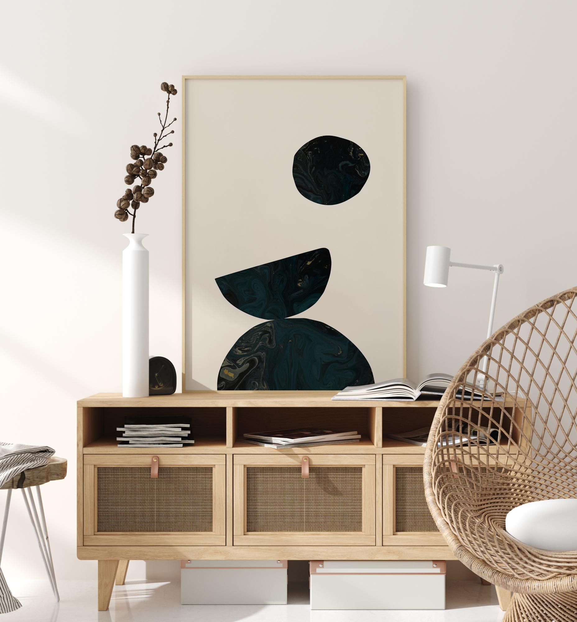 Kirkas juliste, jossa kolme tummansinistä ja mustaa muotoa luovat kiehtovan kuvan. Puoliympyrä on alareunassa tasapainottamassa toista ylöspäin kääntynyttä puoliympyrää. Yläpuolella leijuu musta ympyrä, kaikki silmiinpistävän valkoisella taustalla. Yhdistä kauniit marmoripyörteet vaaleampaan sävyyn seinillä, mikä lisää dramaattisuutta.