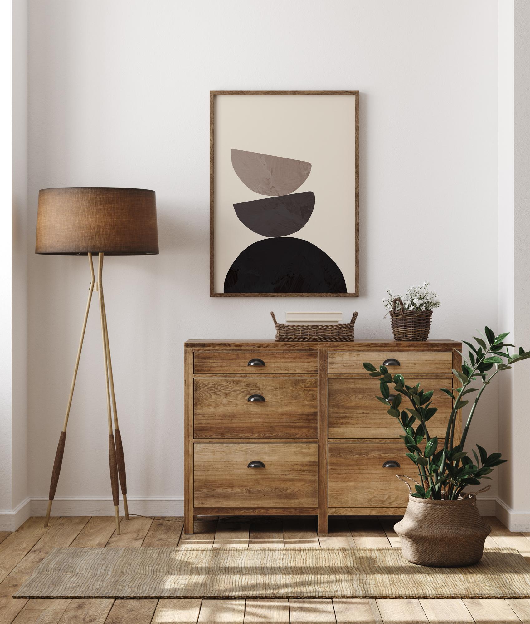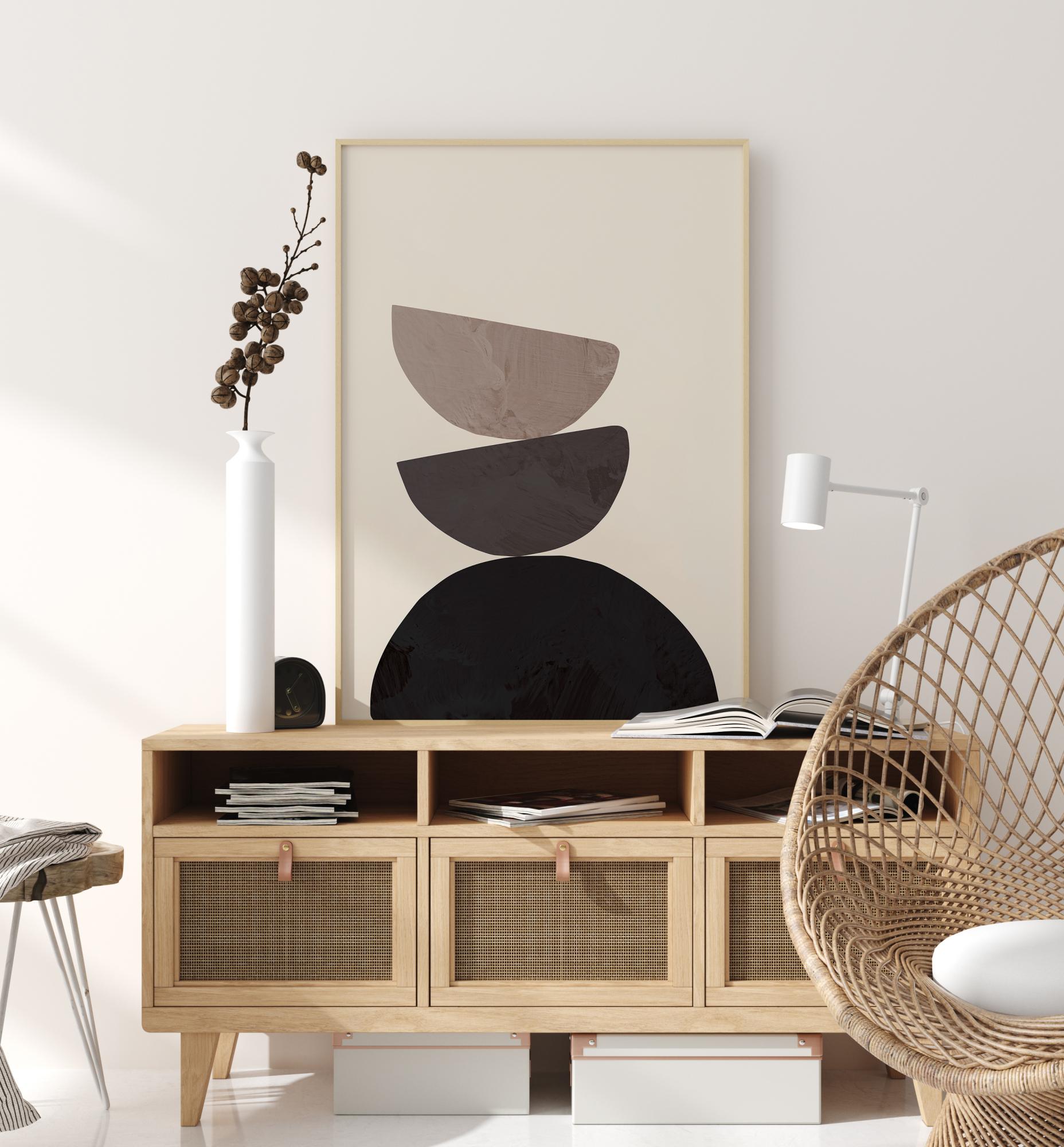 Yksinkertainen abstrakti juliste, jossa on kolme erilaista puoliympyrää. Jokainen puoliympyrä on eri sävyinen harmaa, alkaen mustasta alhaalla ja jatkuen vaaleanharmaaseen ylhäällä. Ne ovat tasapainossa toistensa päällä, mikä tuo teokseen varovaisen vakauden tunteen.