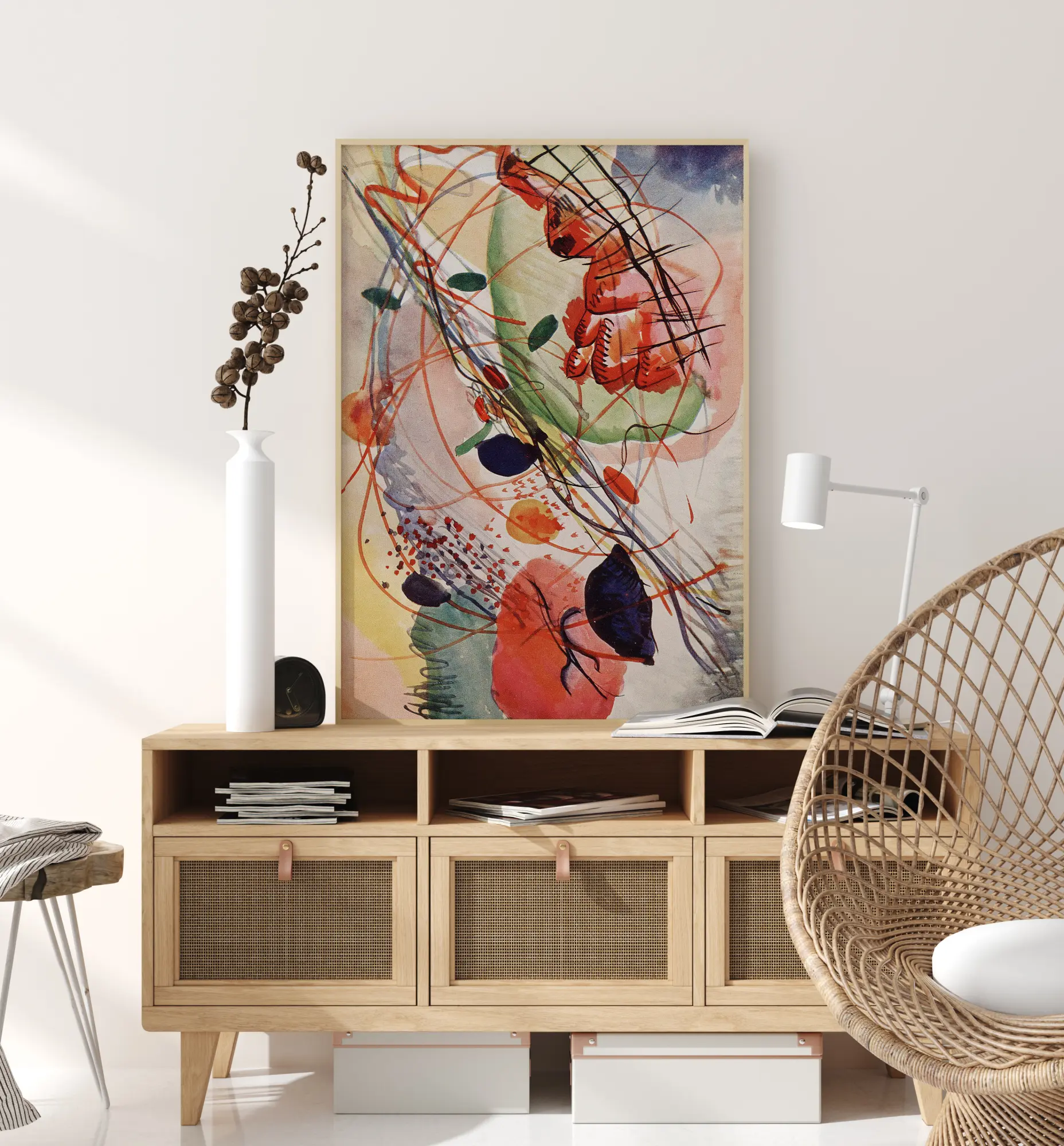 Eloisa juliste täynnä abstrakteja värejä ja muotoja, jotka luovat dramaattisen, lähes kaoottisen teoksen. Suuret väriläiskät, värikkäät pisteet ja raidalliset viivat tekevät tästä dramaattisen teoksen, kun katseesi kulkee kuvassa ja etsii, mitä tapahtuu. Tuo kiireen tuntua, kun ripustat tämän eteiseen.