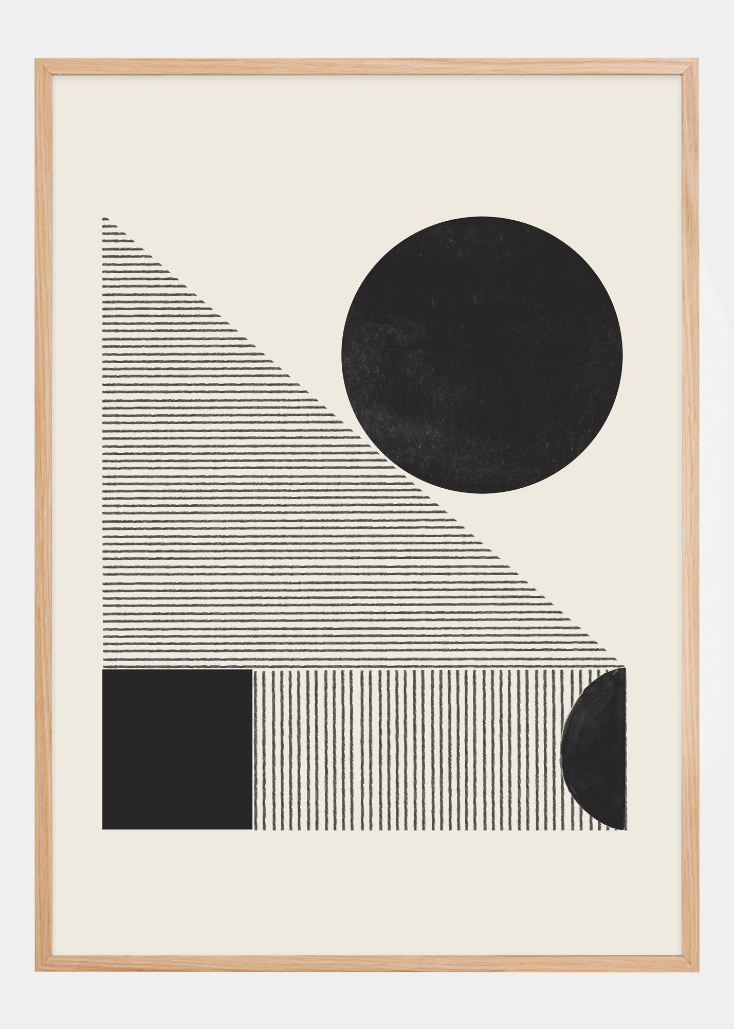 Tämä juliste on leikkisä ja hienostunut tulkinta geometrisesta abstraktiosta. Mustat ja valkoiset viivat vuorovaikuttavat tarkasti tasapainotetussa muotojen kokonaisuudessa, kun taas suuri musta ympyrä hallitsee sommitelman yläosassa luoden vahvan visuaalisen kiintopisteen. Täyteläisten mustien alueiden ja valkoisten viivojen välinen kontrastoiva vuorovaikutus kutsuu katselijaa tutkimaan kuvan eri rakenteita ja syvyyksiä.