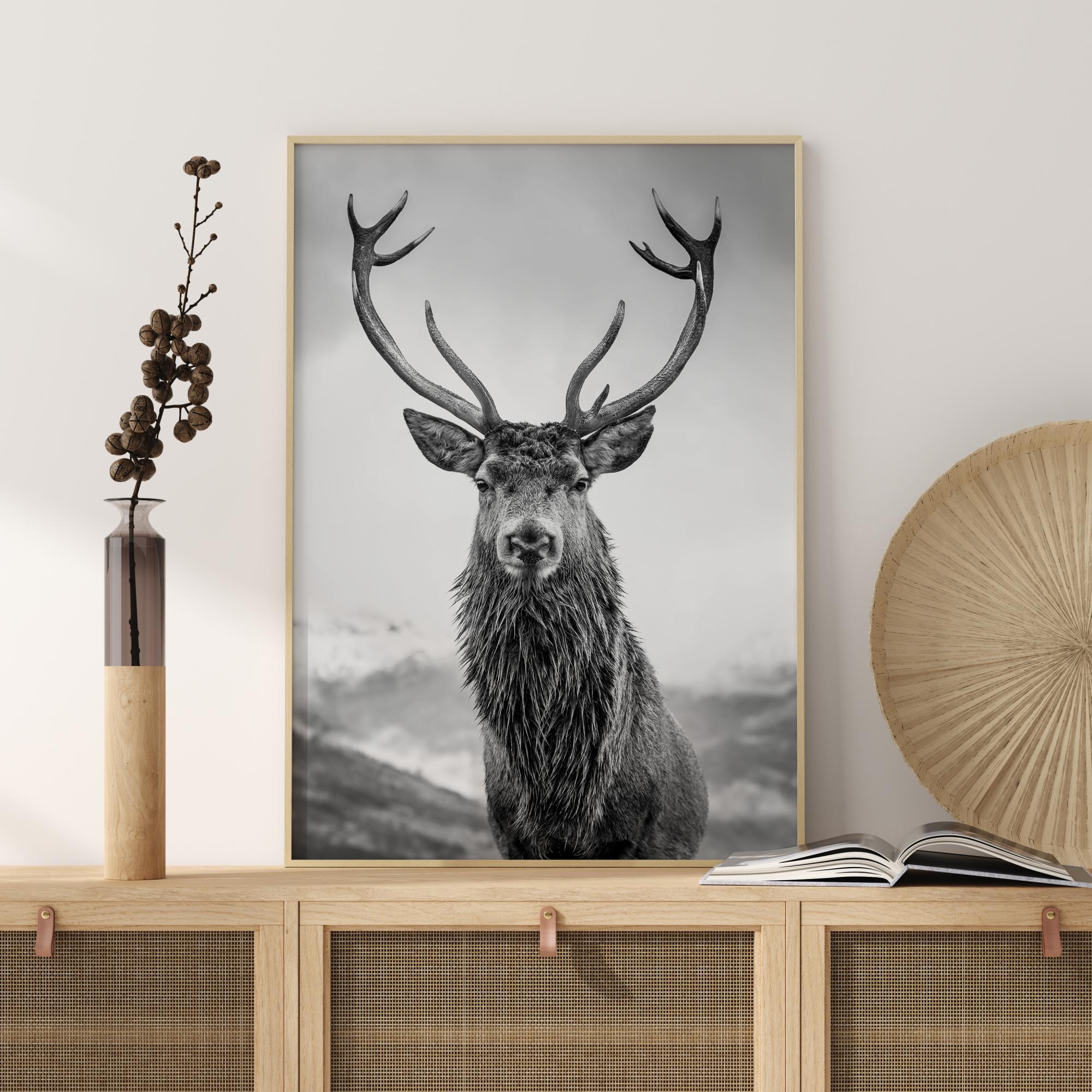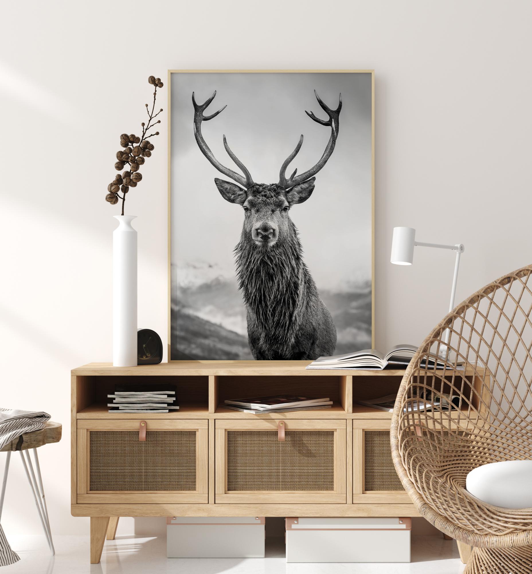 Kuninkaallinen juliste saksanhirven uroksesta. Utelias hirvi tuijottaa suoraan kameraan sarviensa haarautuessa dramaattisesti pilviseen taivaaseen. Takana on kumpuilevia kukkuloita. Tämä mustavalkoinen vedos herää todella eloon vihreällä tai sinisellä seinällä.