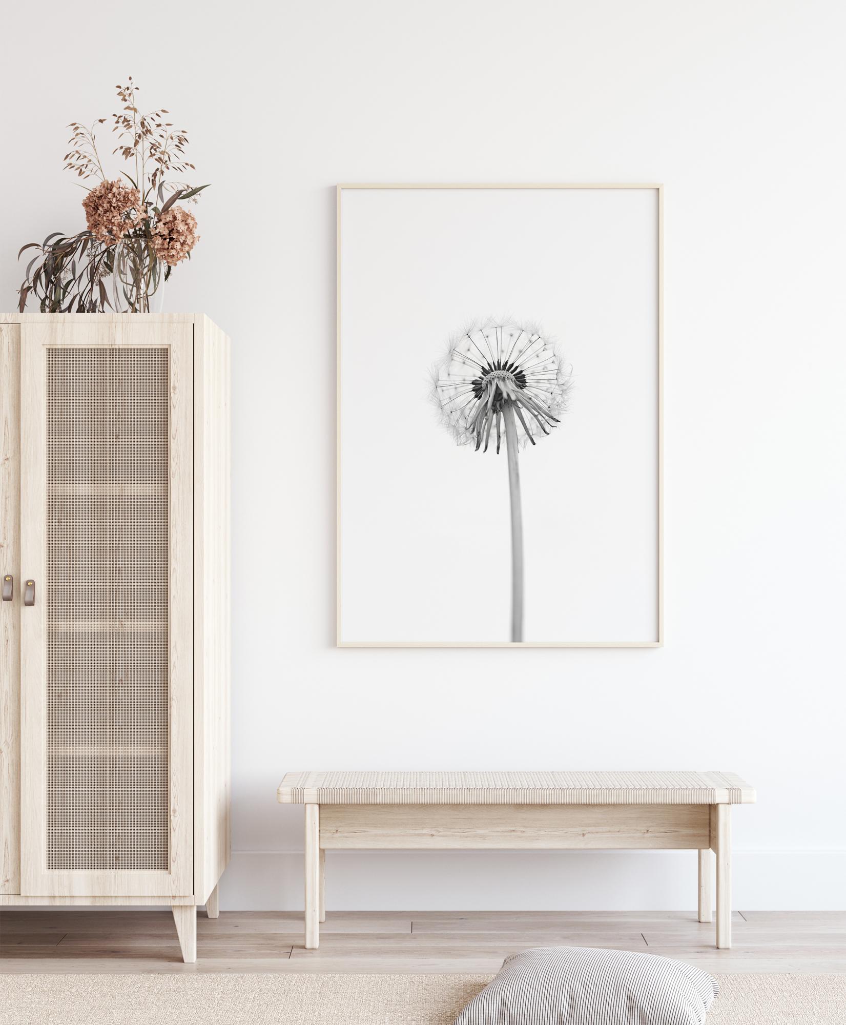Kirkas, puhdas luontojuliste voikukasta valkoista taustaa vasten. Tämä pääasiassa valkoinen otos erottuu elinvoimaisen sinistä tai vihreää seinää vasten. Se on täydellinen tuloste gallerian seinälle.