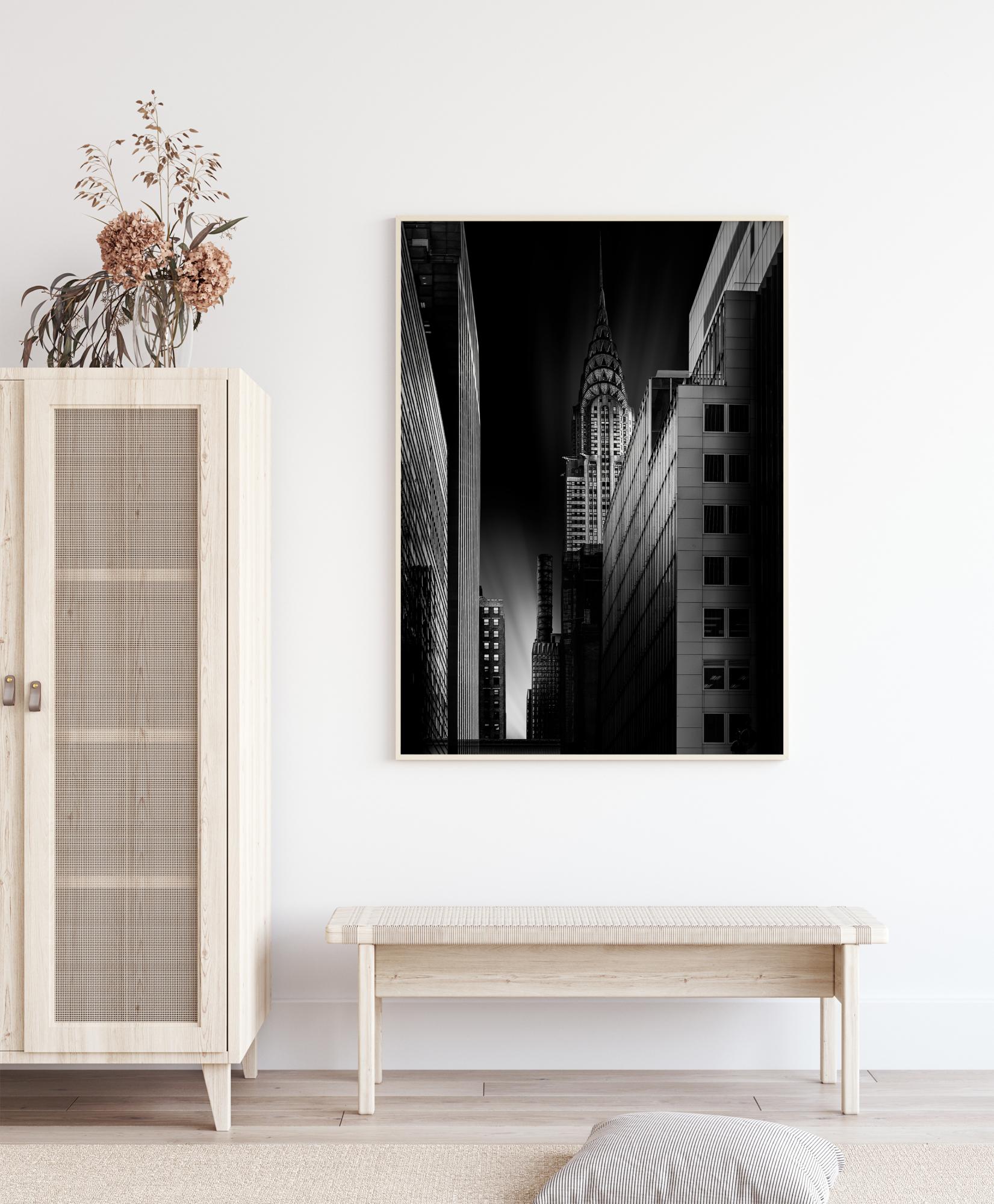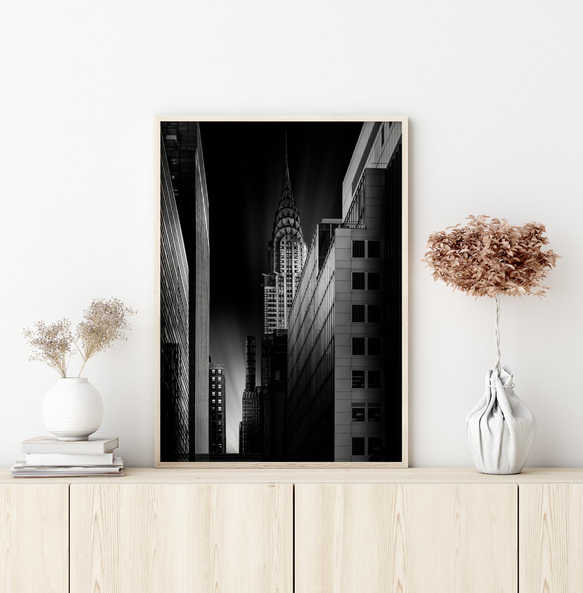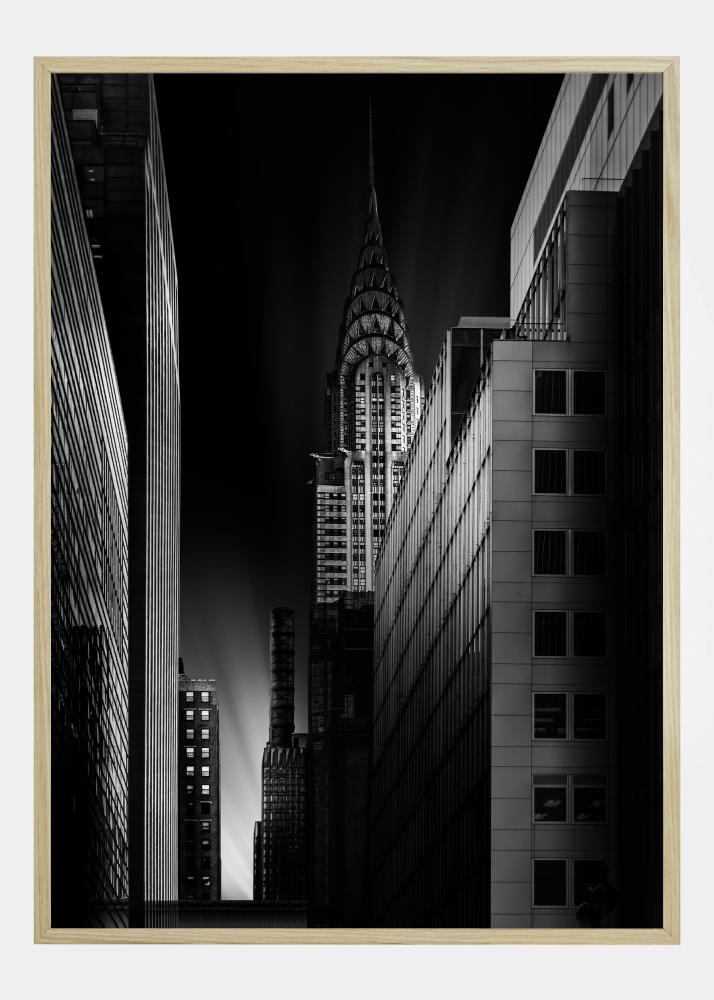 Kaupunkijuliste Chrysler-rakennuksesta yöllä. Kapea katu vetää katseen alas taivaalle osuvaan kirkkaaseen valonpilkahdukseen. Oikealla näkyy varjoinen Chrysler-rakennus tässä hieman aavemaisessa otoksessa. Ripusta valkoiselle seinälle taidegalleriatunnelmaa varten.
