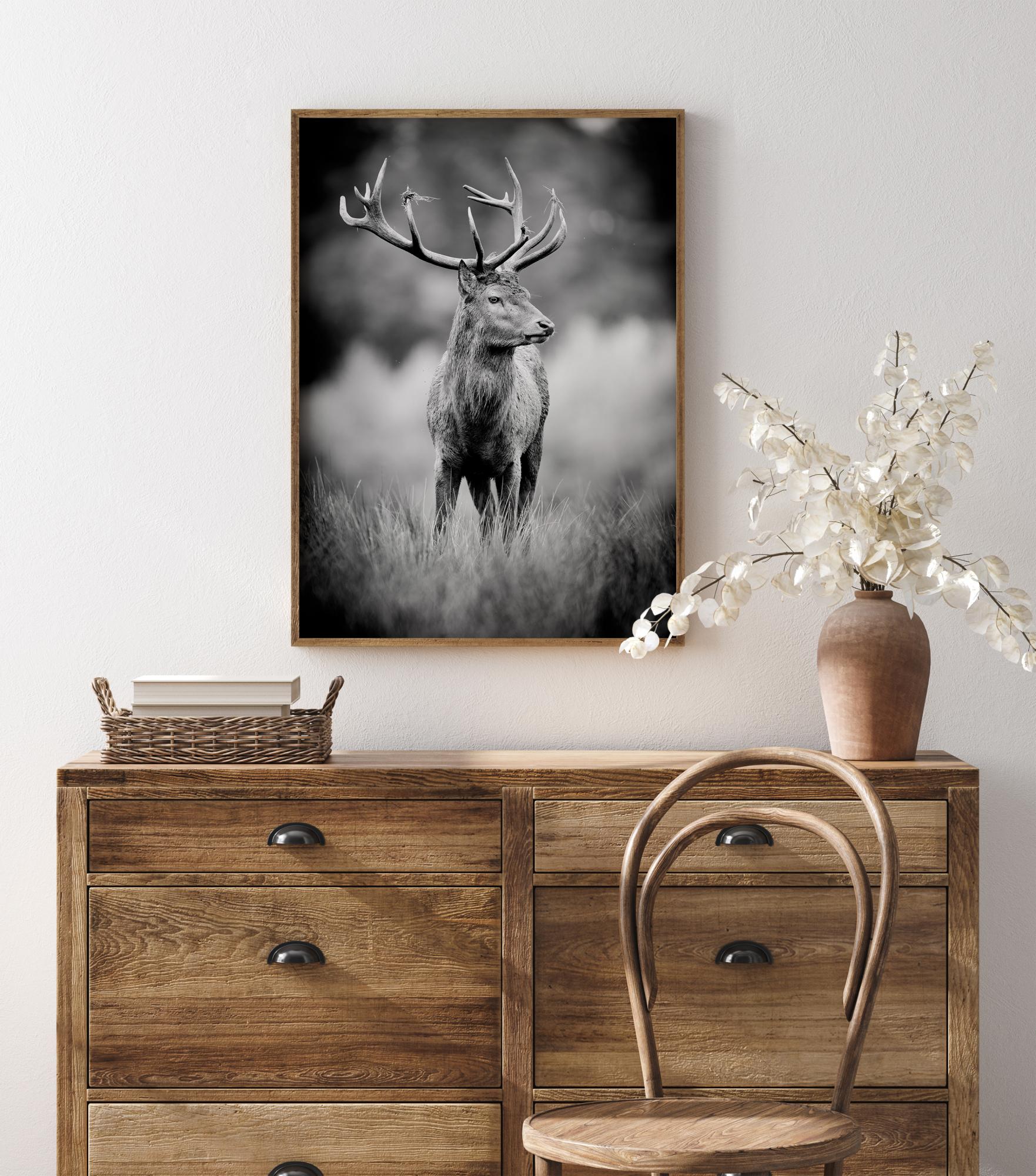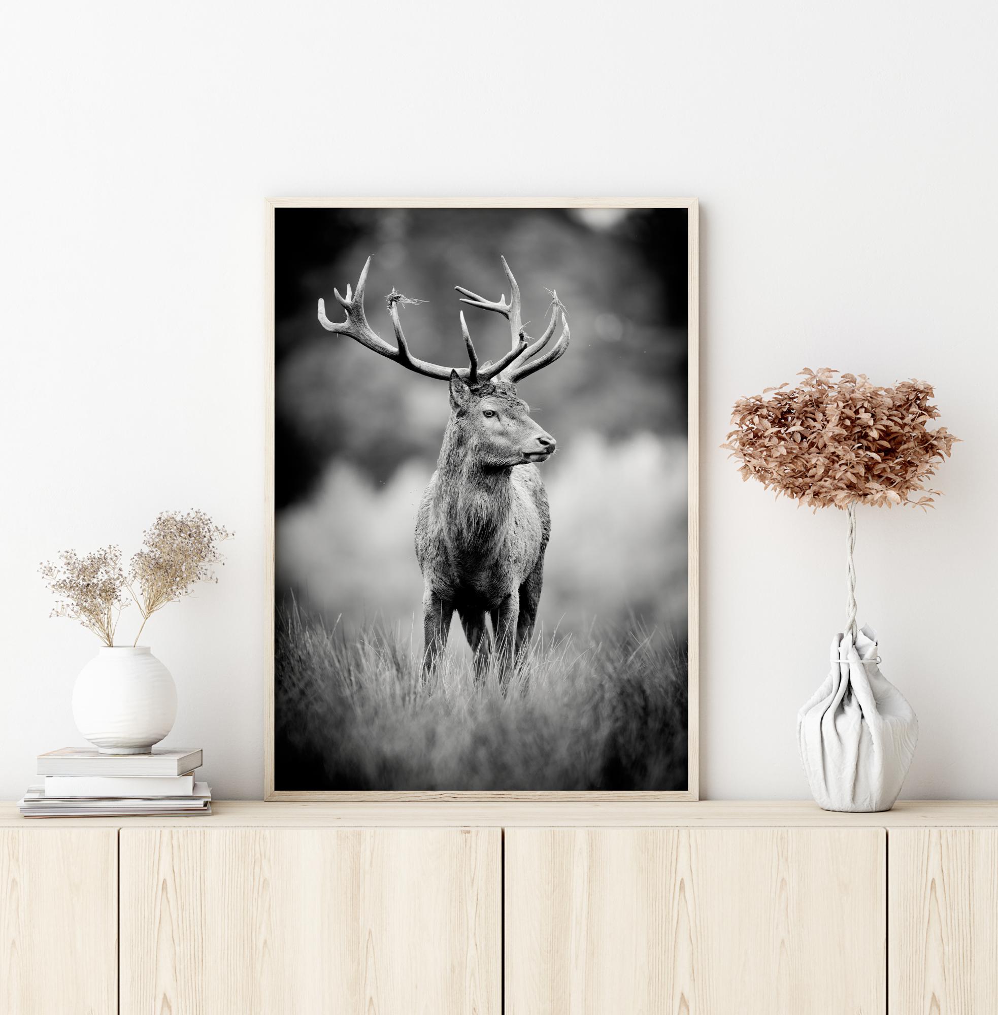 Mustavalkoinen luontojuliste, jossa on sarvipäinen hirvi. Teoksen design saa tämän tuntumaan siltä, kuin katselisit sitä kaukaa kiikareilla, kuten luonnossa, mikä tekee tästä kohtauksesta vieläkin erikoisemman. Hänen kääntynyt päänsä tarkoittaa, että hän katsoo takaisin sinuun ja vetää sinut puoleensa.