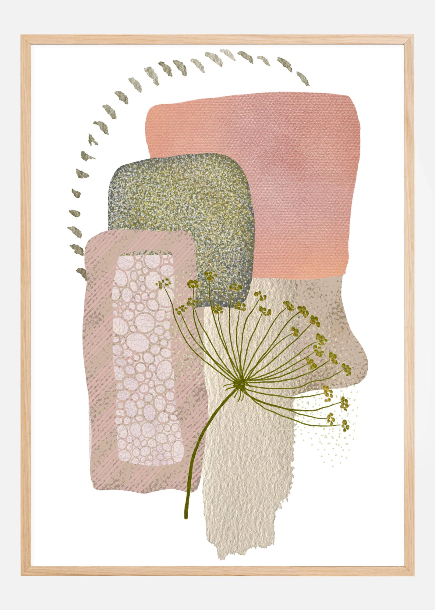 Tämä juliste luo rauhan ja kauneuden tunnetta sen rentouttavien pehmeiden sävyjen ja abstraktien muotojen yhdistelmän kautta. Keskellä sommitelmaa on herkkä kukkavarsi, joka ulottuu ylöspäin, ja sen pienet vihreät nuput kevenevät ohuen, sulavan varren mukana. Tekstuurin ja värin kerrostumat luovat syvyyttä ja kiinnostusta, jotka vangitsevat katseen ja kutsuvat pidempään tarkasteluun. Rauhoittavan vaaleanpunaisen ja vihreän paletin ansiosta tämä taideprintti viestii luonnon hiljaisuutta ja yksinkertaisuutta, tehden siitä kauniin lisän jokaiseen kotiin.