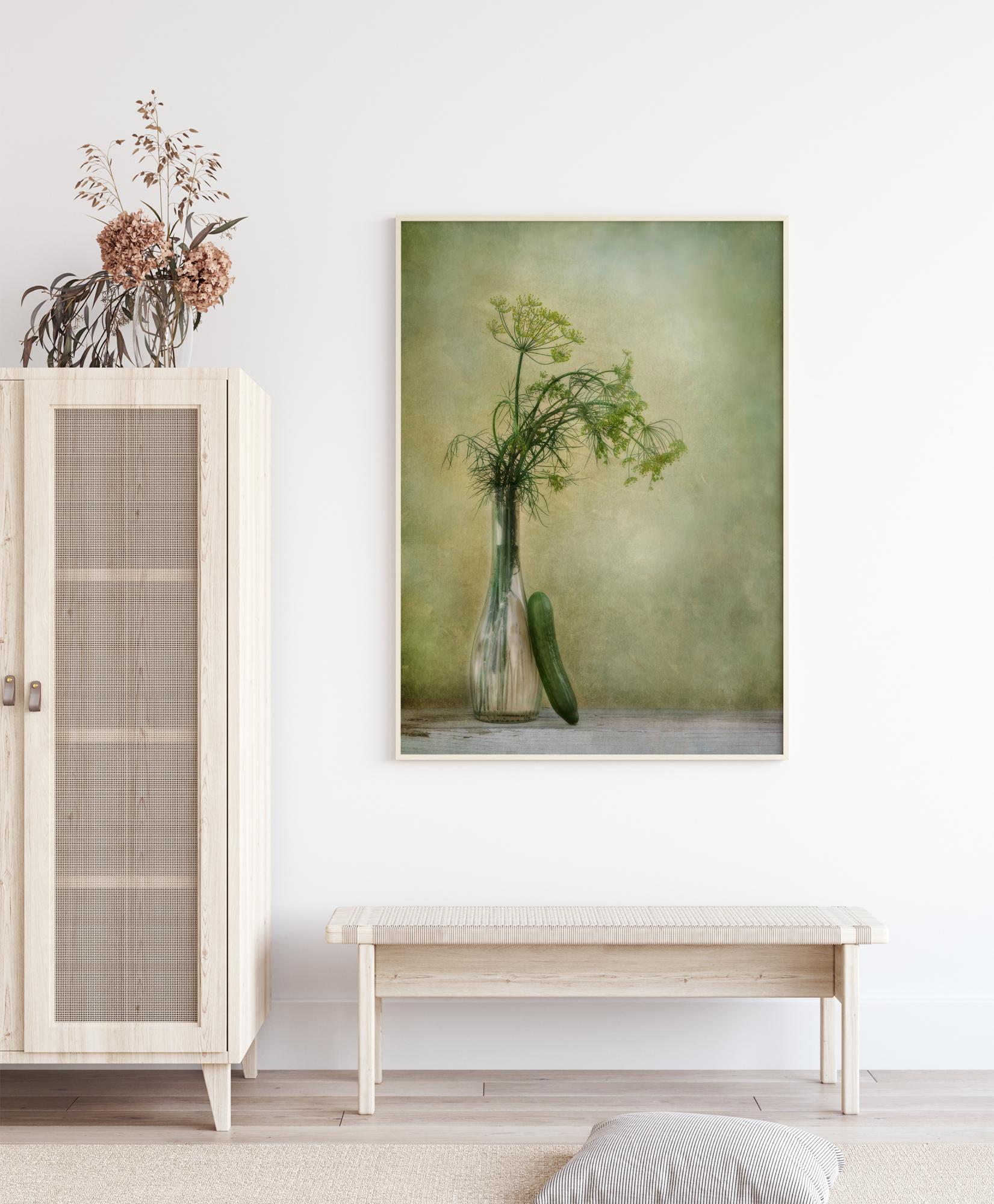 Vihannesjuliste tillistä ja kurkusta pehmeää vihreää ja keltaista seinää vasten. Lasimaljakossa on tillivarsia, ja kurkku nojaa sitä vasten tässä asetelmakuvassa. Taustan pehmeät akvarellityyliset sävyt ovat vaaleampia lehtien ympärillä ja tummempia reunoja kohti. Ripusta tämä keittiöön, niin saat söpön, kasvispainotteisen tunnelman.