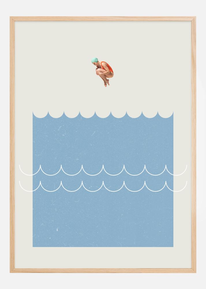 Tämä juliste on leikkisä tulkinta kesäpläiskystä, jossa pieni hahmo uima-asussa ja uimalakissa näkyy vapaassa pudotuksessa kohti aaltojen tyyliteltyä kuvitusta. Minimalistinen muotoilu yhdistää todellisuuden ja abstraktion, tarjoten luovan ja virkistävän näkökulman klassiseen kesäajan ja kylpemisriemun teemaan.