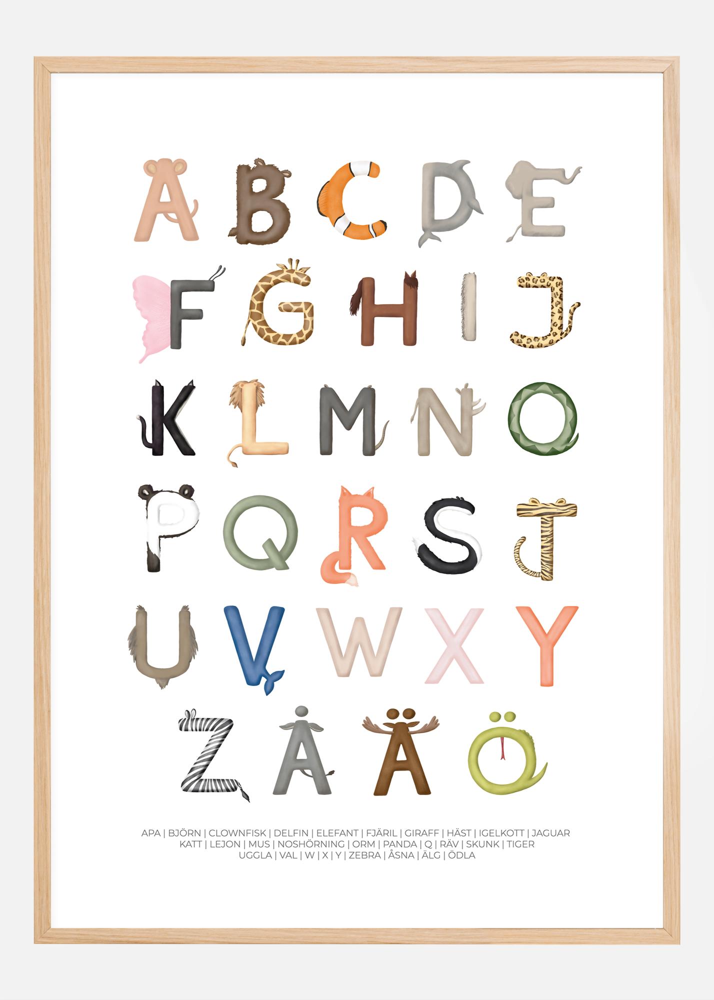 Tämä leikkisä ja opettavainen juliste on täydellinen herättämään lasten uteliaisuutta ja oppimista. Se esittelee aakkoset eri eläinten kautta, jokainen kirjain on ainutlaatuisesti muotoiltu kuvaamaan eläintä, jonka nimi alkaa juuri kyseisellä kirjaimella. 'A' on apina ja 'Ö' on lisko, jokainen hahmo on rikkaasti kuvattu selkeällä, ystävällisellä ja värikkäällä tyylillä. Se sisältää myös kolme ylimääräistä kirjainta ruotsalaisessa aakkostossa: 'Å', 'Ä' ja 'Ö', tarjoten täydellisen kielellisen kokemuksen.