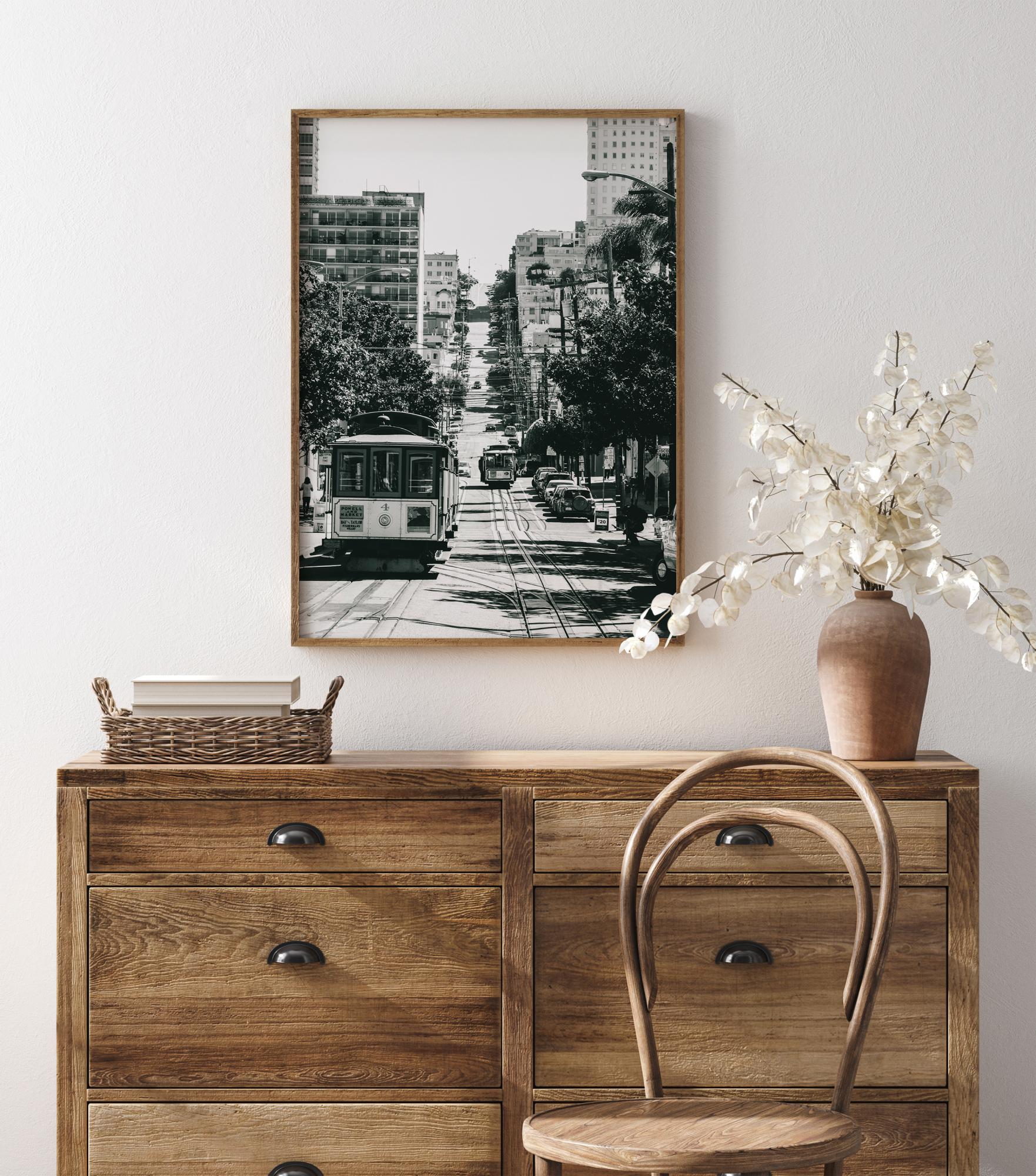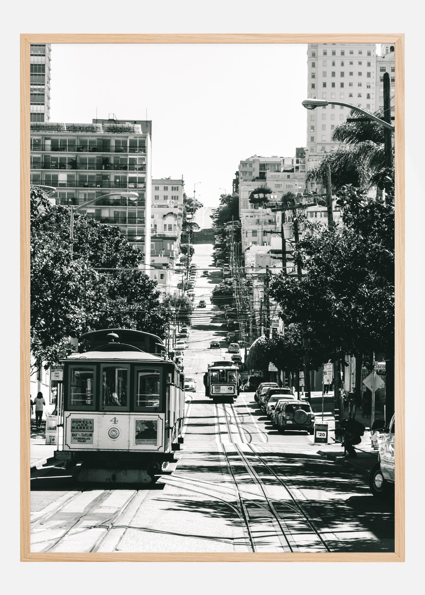 Kaupunkikuvajuliste San Franciscon keskustasta. Raitiovaunu on teoksen etualalla, ja se nousee mäkeä ylöspäin molemmin puolin olevien talojen ja puiden läpi. Tämä mustavalkoinen tuloste tuo tyylikkyyttä mille tahansa seinälle, jolle päätät ripustaa sen kotonasi.