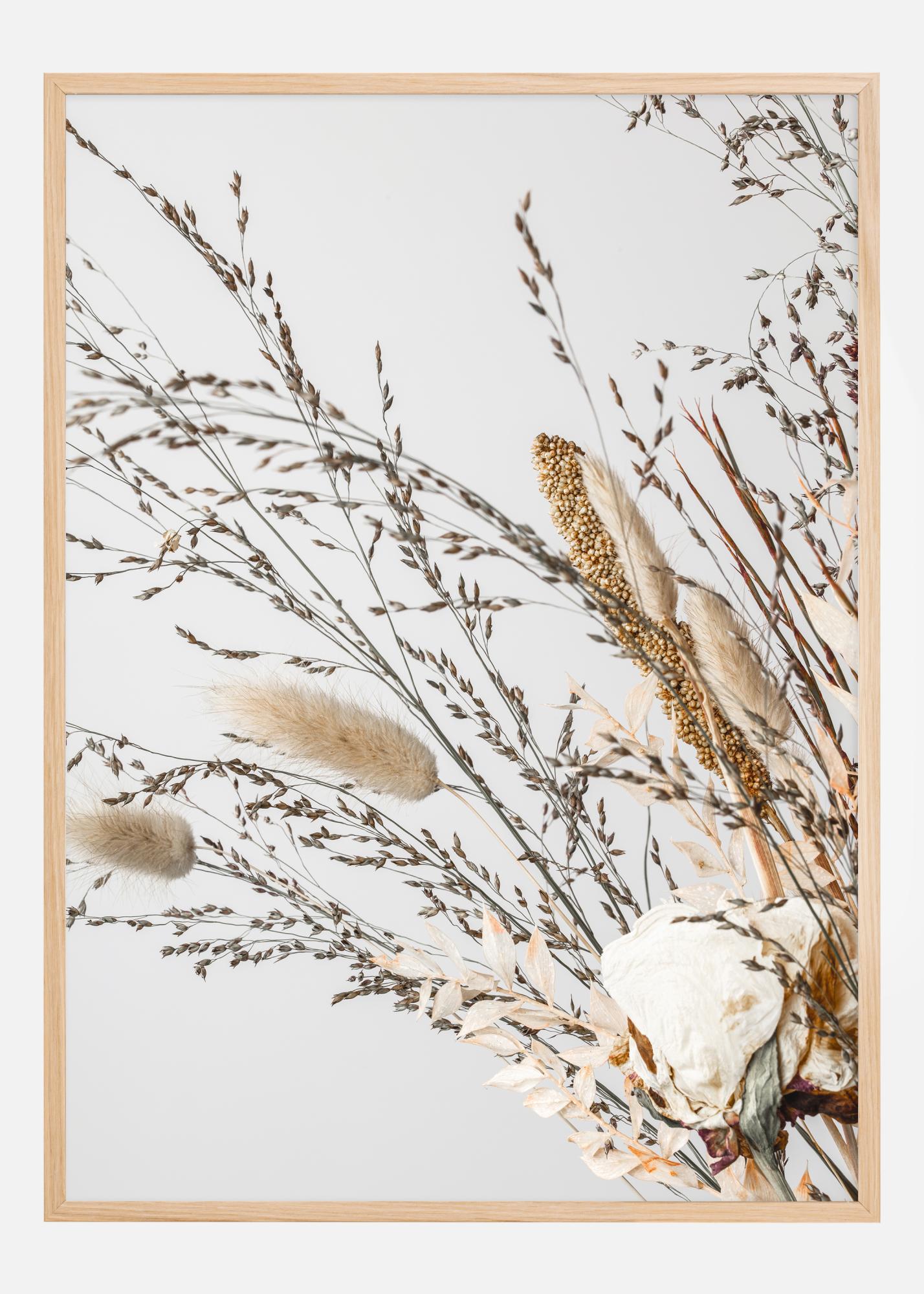 Tämä juliste juhlistaa luonnon hiljaista eleganssia, esittäen monipuolisen järjestelyn kuivattuja kasveja. Luonnollinen sommitelma on täynnä herkkiä linjoja ja orgaanisia muotoja, huojummeista heinänkorreista tukevampiin tähkiin ja hienovaraisesti sävyttyneisiin lehtiin. Kuivattujen kasvien ruskea-beige paletti puhdasta valkoista taustaa vasten luo lämmön ja luonnon tuntua, joka on vangittu hiljaisuuteen.